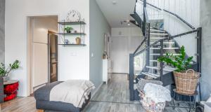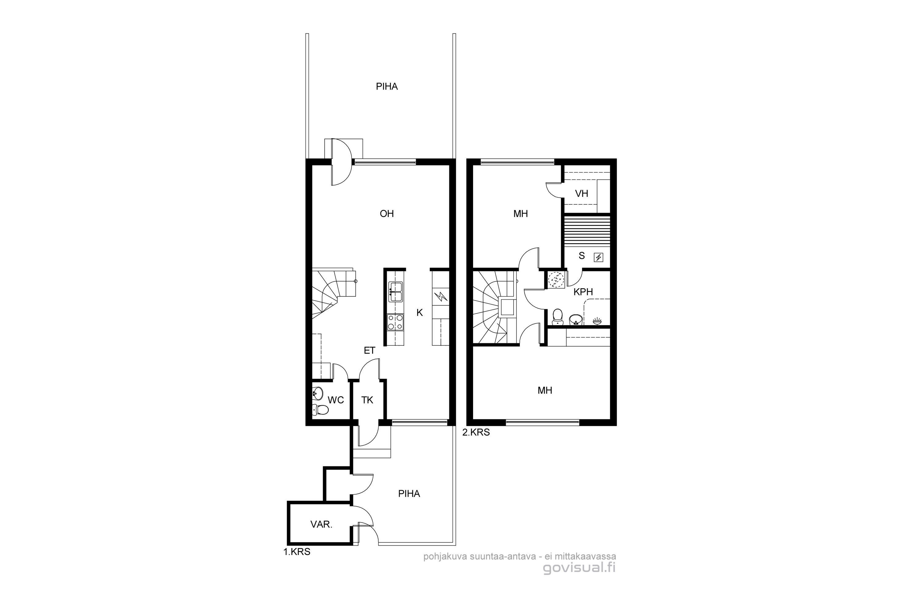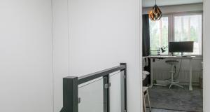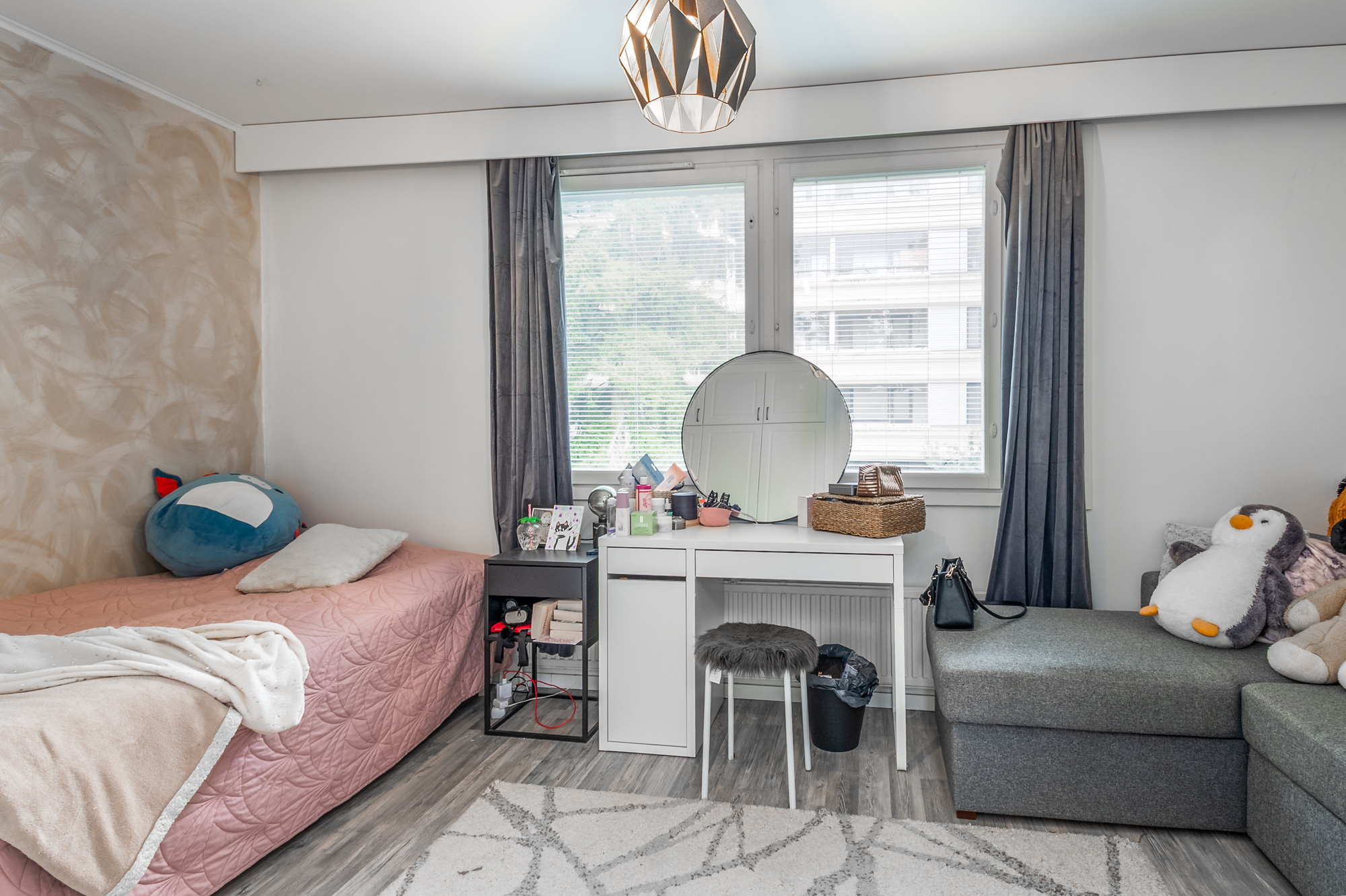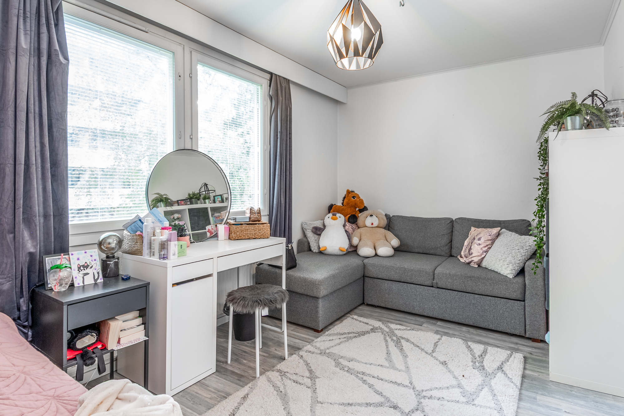 Alakerrassa keittiö yhdistyy olohuoneeseen. Olohuoneesta on kulku lännen puoleiselle omalle piha-alueelle terasseineen. Yläkerrassa on saunaosaston lisäksi kaksi erittäin tilavaa makuuhuonetta, joista toisen yhteydessä on vaatehuone.