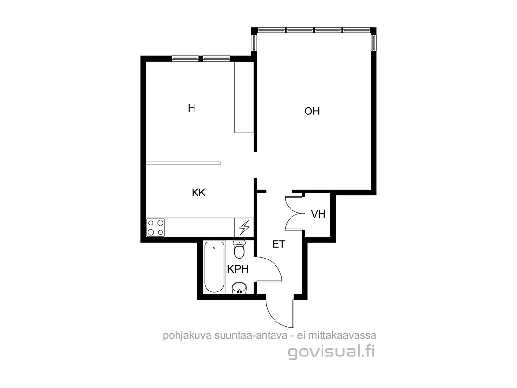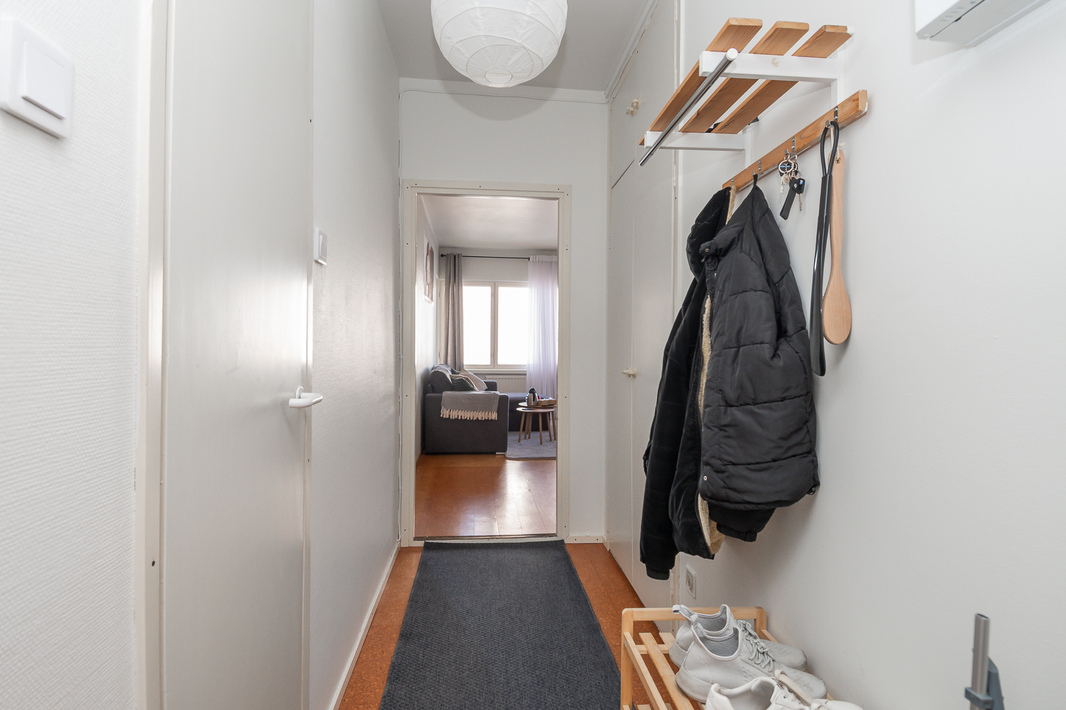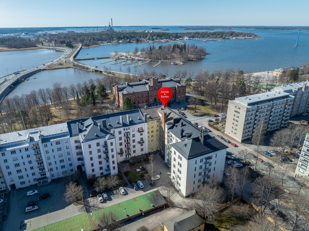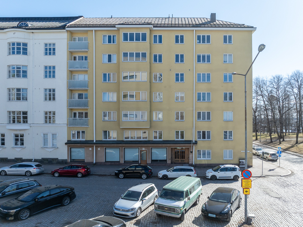 Kaksio sijaitsee hissitalon neljännessä kerroksessa ja asunnosta on avarat kaupunkinäkymät Hovioikeuteen ja rantapuistoon. Olohuone, keittiötila ja makuuhuone jaettu lasiseinällä, eteinen ja kylpyhuone.
