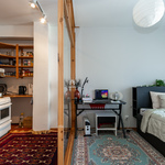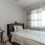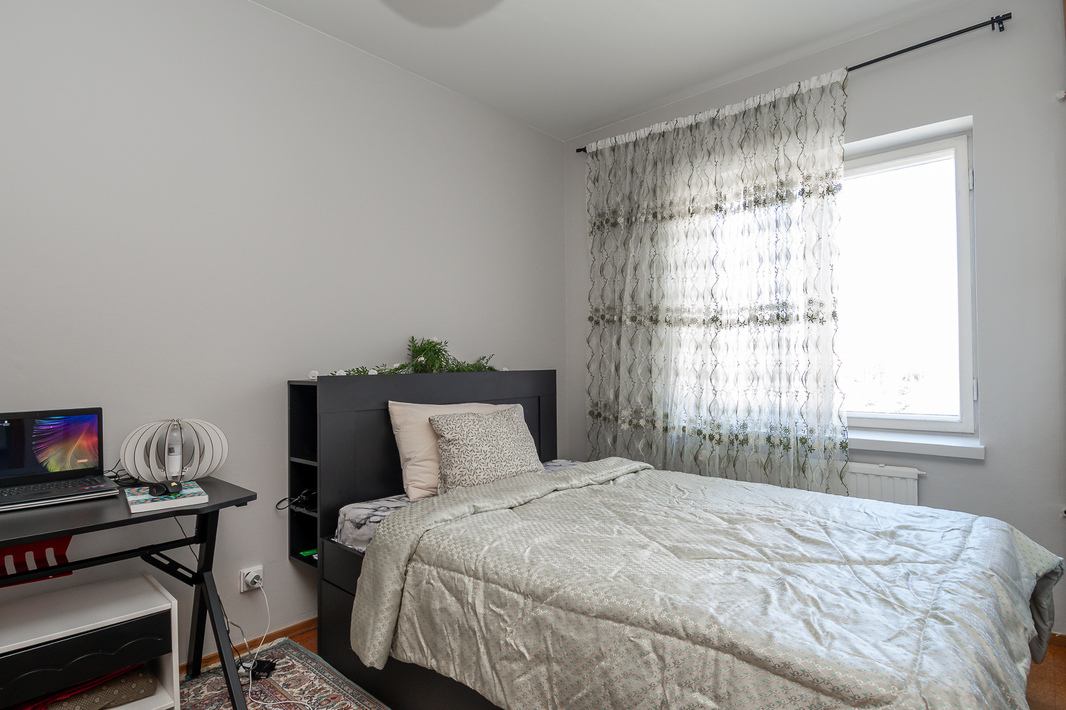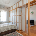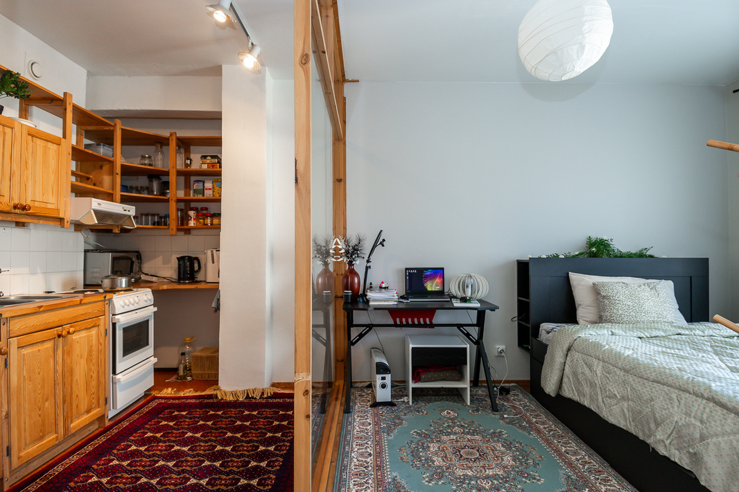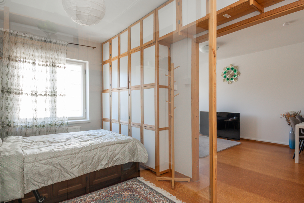 Makuuhuoneen kuvaus Makuuhuone jaettu lasiseinällä keittonurkasta. Korkkimatto.
