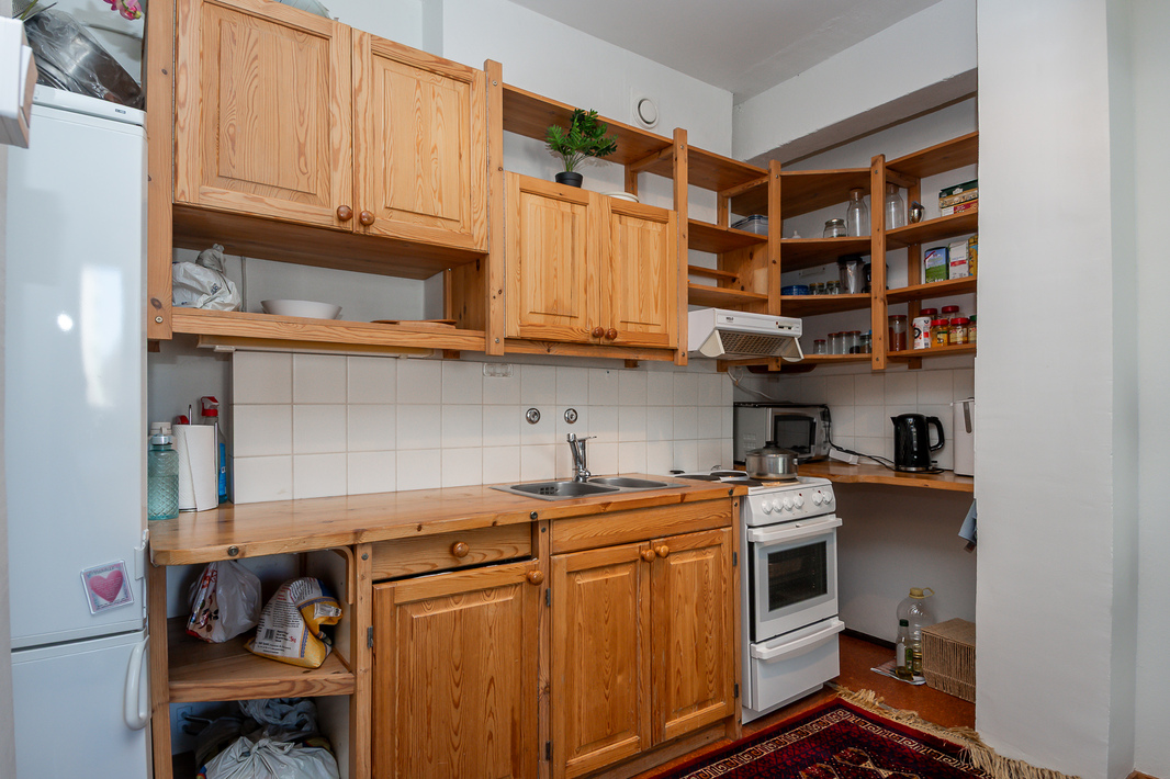 Keittiön varustelu Keittonurkka jaettu lasiseinällä makuuhuoneesta. Jääkaappi/pakastin, sähköliesi, liesituuletin. Korkkimatto.