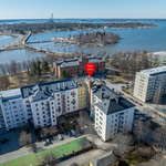 Lägenheten ligger på fjärde våningen i ett hus med hiss och har en öppen stadsutsikt mot hovrätten och strandparken. Vardagsrum, köksvrån och sovrummet är avskilda med en glasvägg, samt entré och badrum.