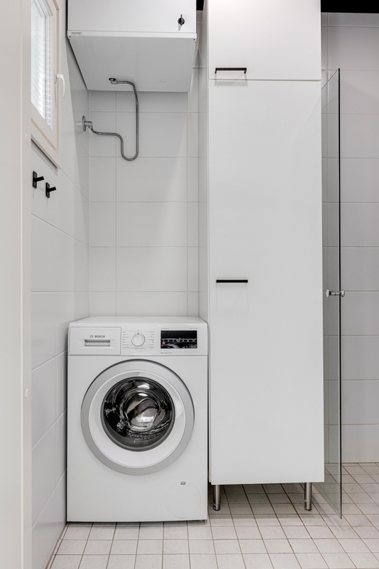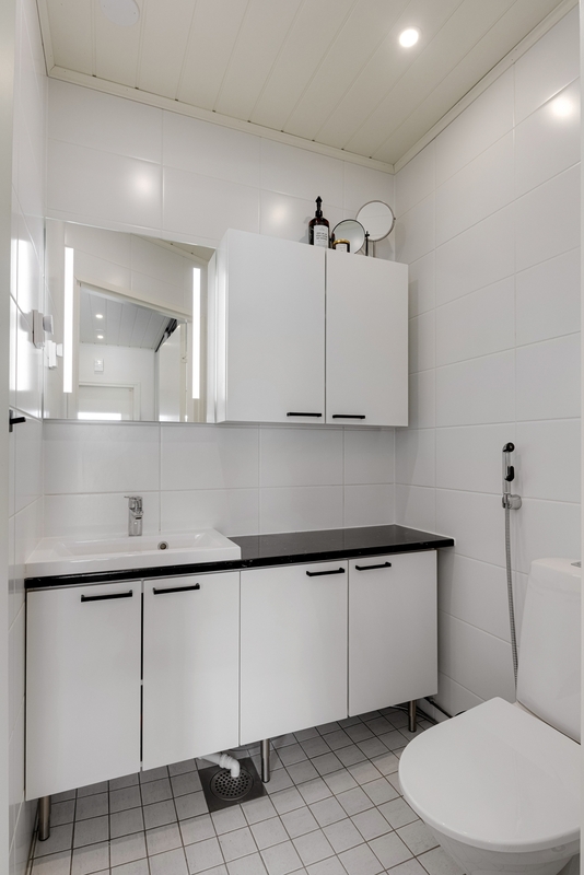 | Kylpyhuoneen kuvaus | Kylpyhuone tyylikkään saunan yhteydessä. Pesukoneliitäntä, tilaa pesutornille. Lisäksi erillinen wc. |