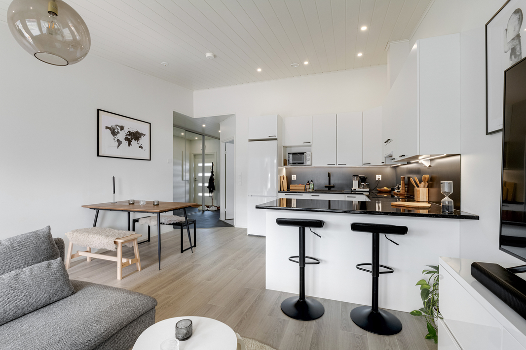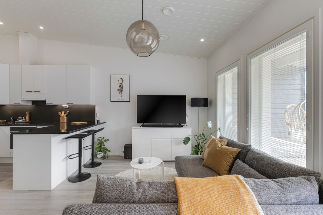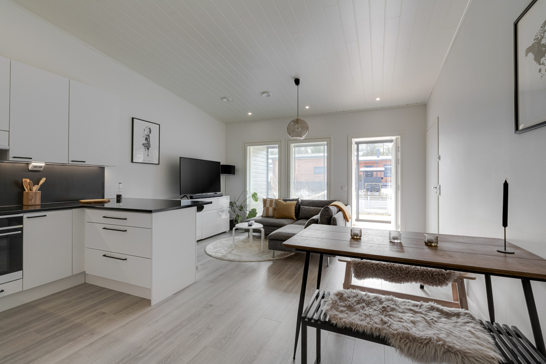 Hyvin suunnitellut tilat - olohuone ja keittiö yhtä tilaa, missä avaruutta lisää korotettu sisäkatto ja isot ikkunat terassin suuntaan. Reilun kokoinen makuuhuone, missä vaatekaapisto.