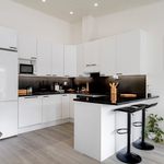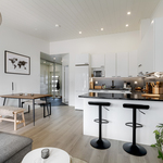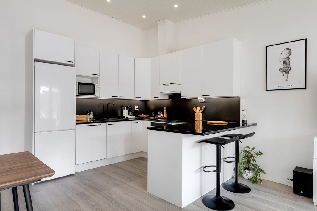 | Keittiön varustelu | Keittiö ja olohuone yhtä tilaa. Jääpakastinkaappi, induktioliesi, liesituuletin, kalusteuuni, integroitu astianpesukone. Oleskelutilassa korotettu sisäkatto. |