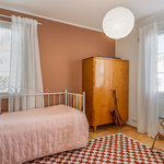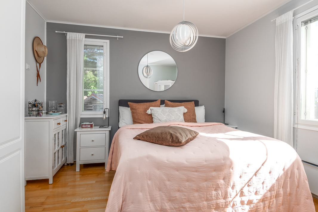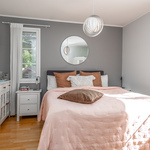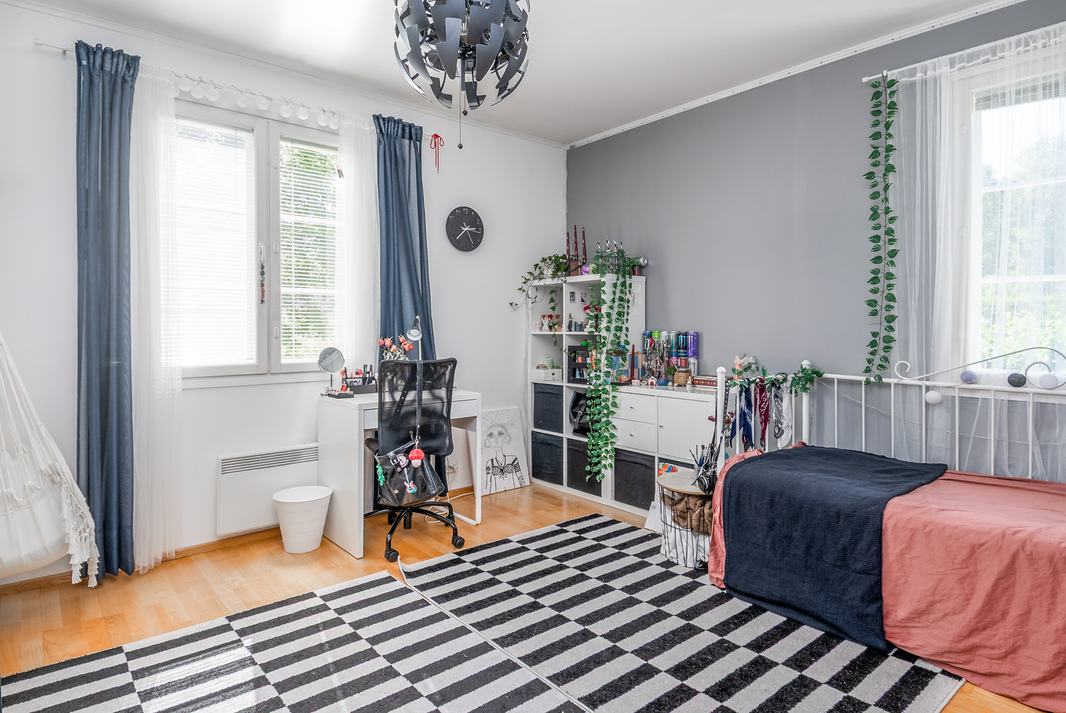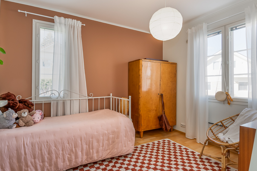 Makuuhuoneen kuvaus Alakerrassa 3 makuuhuonetta - yhdessä vaatehuone ja yhdessä vaatekaapisto. Parkettilattia. Yläkerrassa kaksi makuuhuonetta - vaatekaapistot, muovimatto.