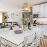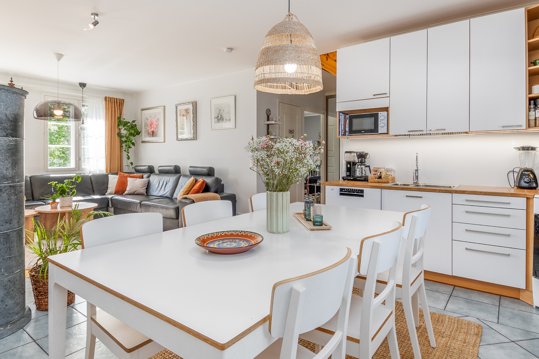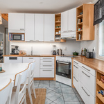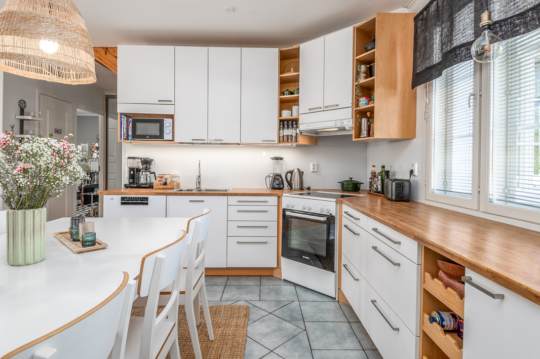 Keittiön varustelu Puustelli-keittiö (ovet ja tasot uusittu 2021) yhdistyy olohuoneeseen. Tilaa 6-hengen ruokapöydälle. Jääkaappi, pakastin, keraaminen liesi (2022), liesituuletin ja astianpesukone (2025). Lattalattia ja lattialämmitys.