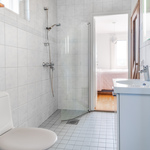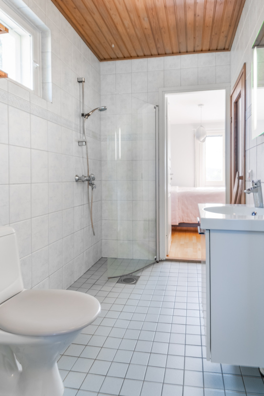 Kylpyhuoneen kuvaus Kylpyhuone sauna yhteydessä. Lattalattia ja seinäkaakelit. Lattialämmitys.
