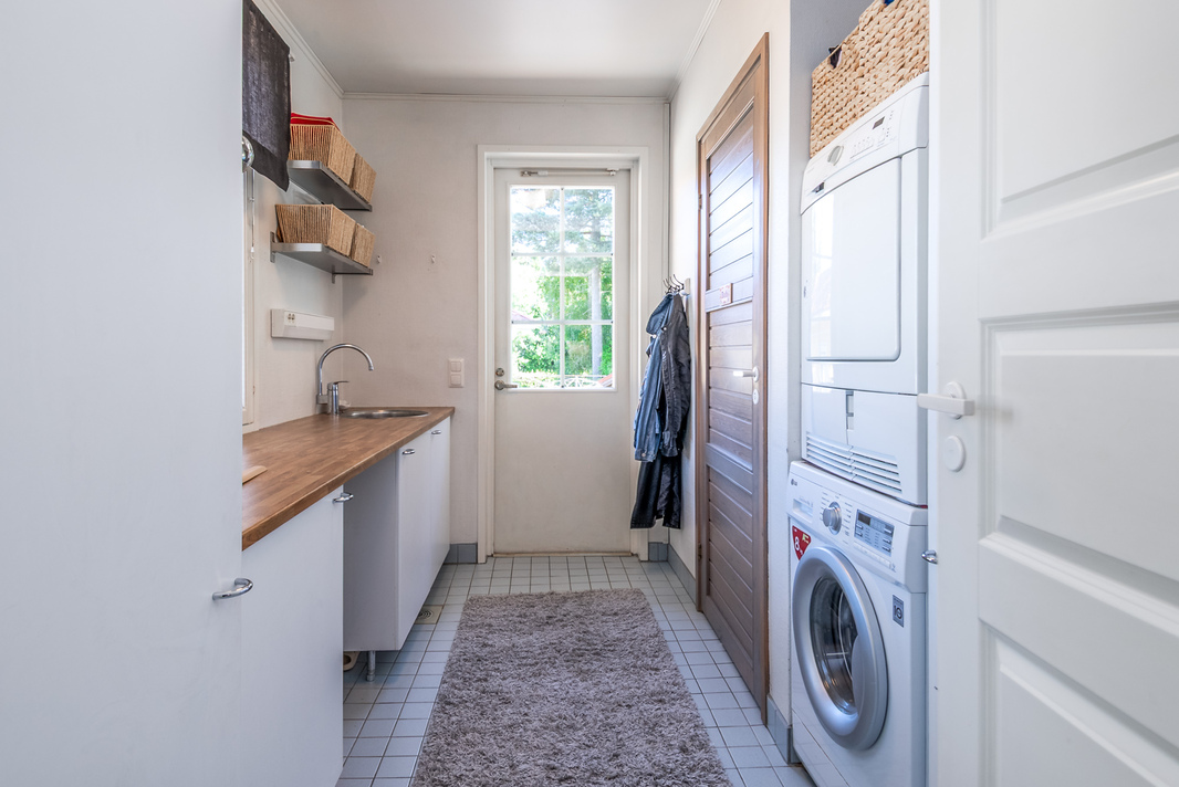 Alakerrassa Puustelli-keittiö yhdistyy olohuoneeseen. Varaava Tulikivi-takka. Tilava kodinhoitohuone, saunaosasto, erillinen WC ja kolme makuuhuonetta. Lämmin, noin 5 m²:n kuisti.