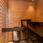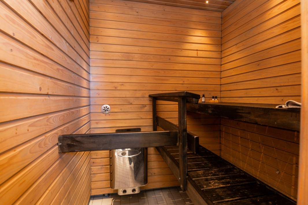 Saunan kuvaus Paneelit ja lattialaatta. Lattialämmitys.