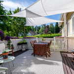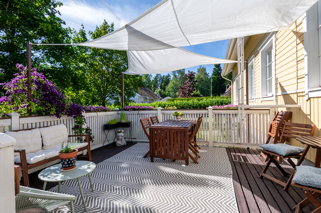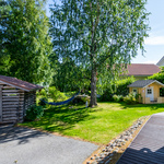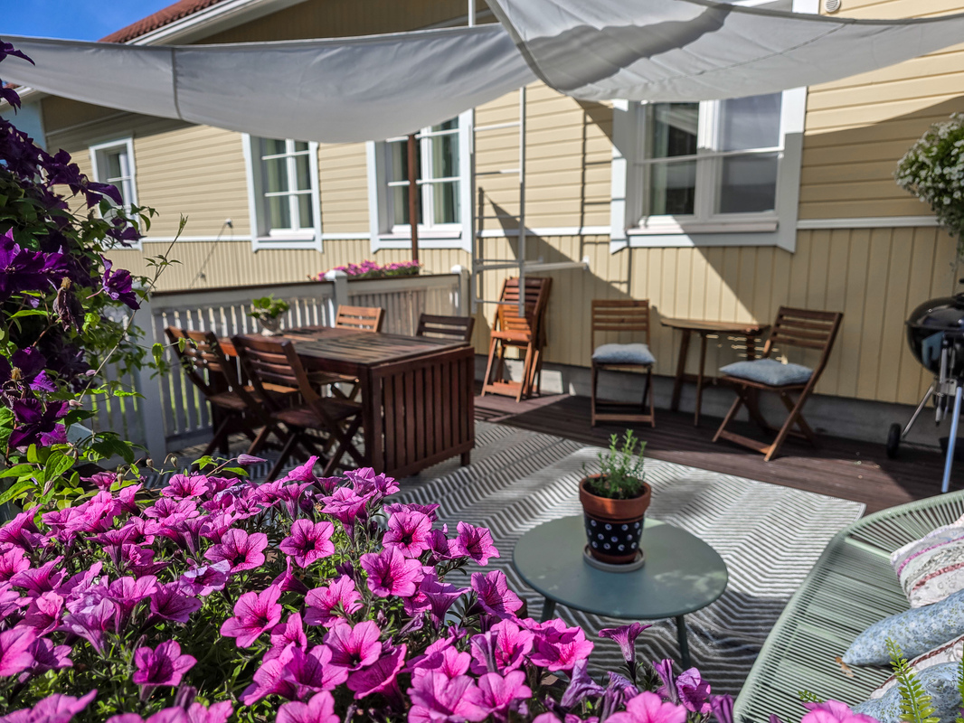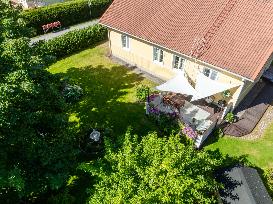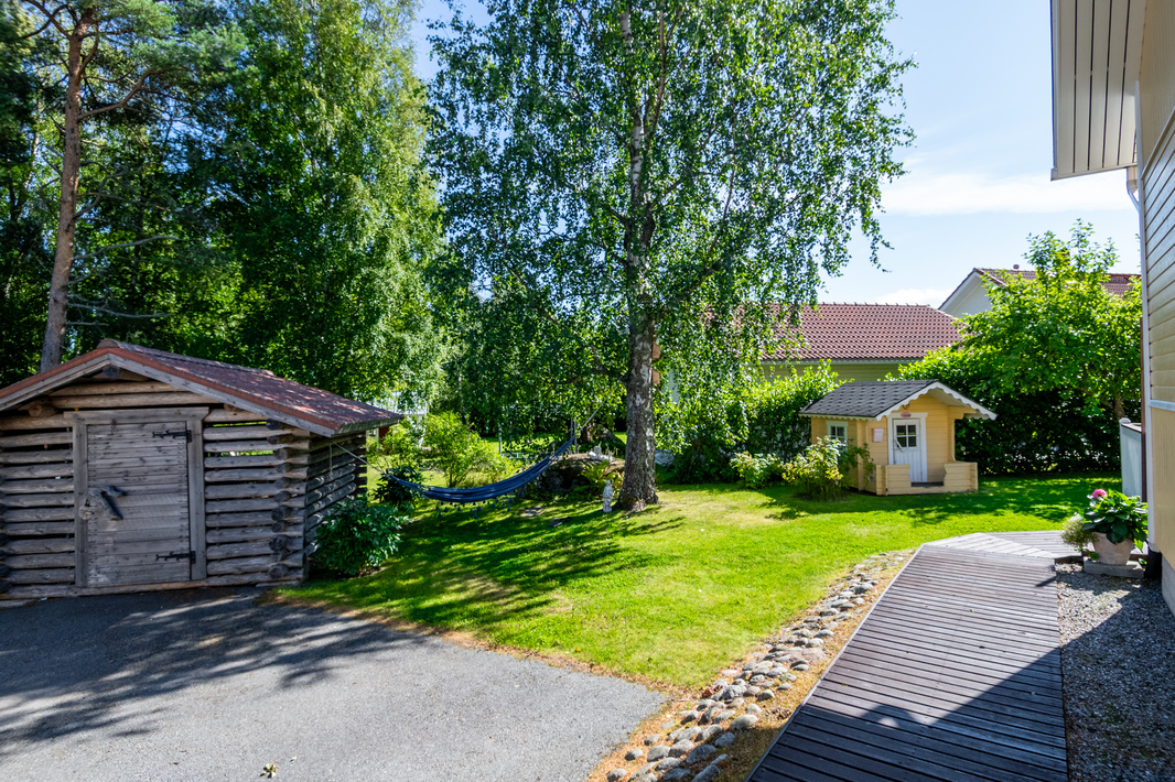 Stor, grönskande gård med träbod, lekstuga och terrass både på fram- och baksidan. Varmt garage på 36 m².