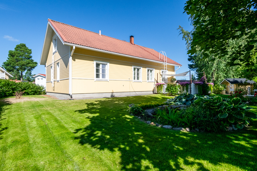 Iso, vehreä piha, jossa puuaitta, leikkimökki sekä terassi sekä etu- että takapihalla. 36 m²:n lämmin autotalli.