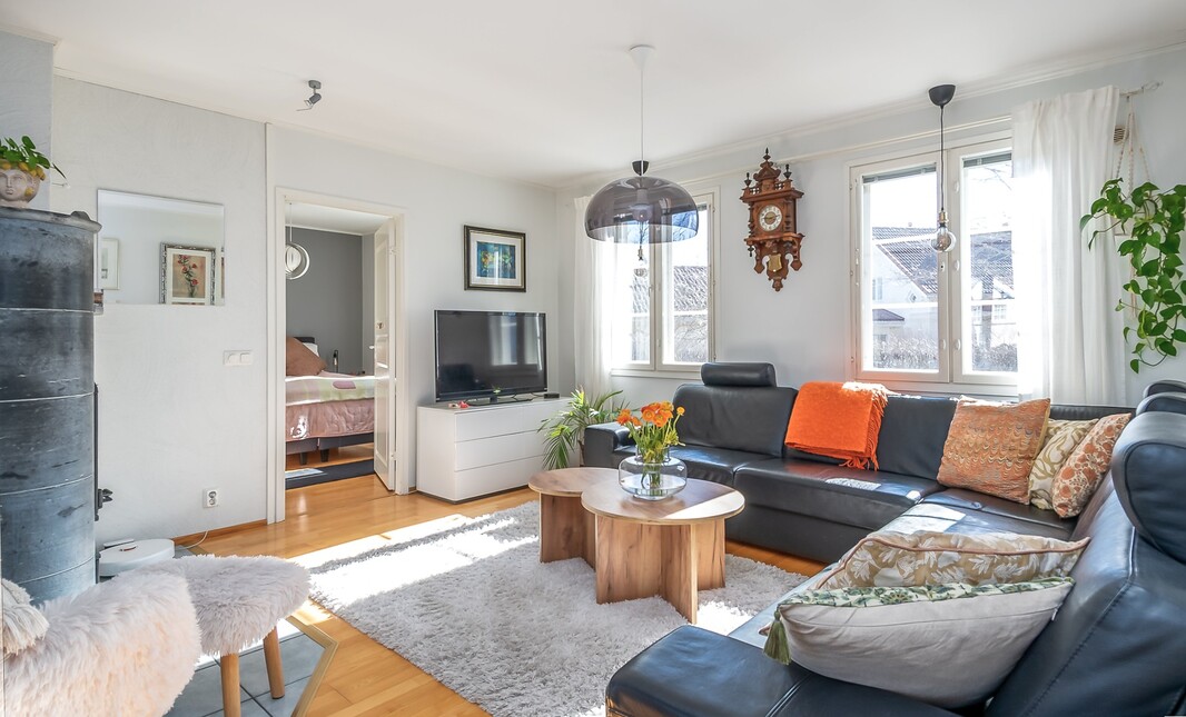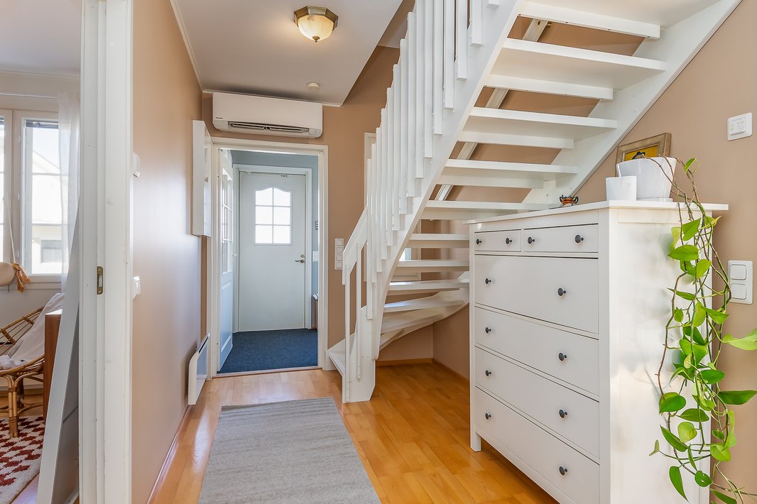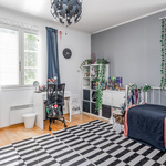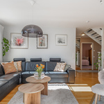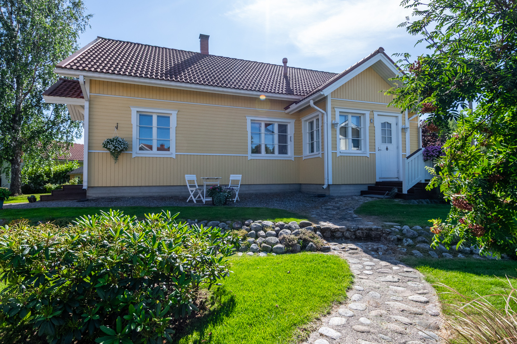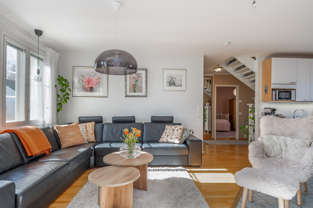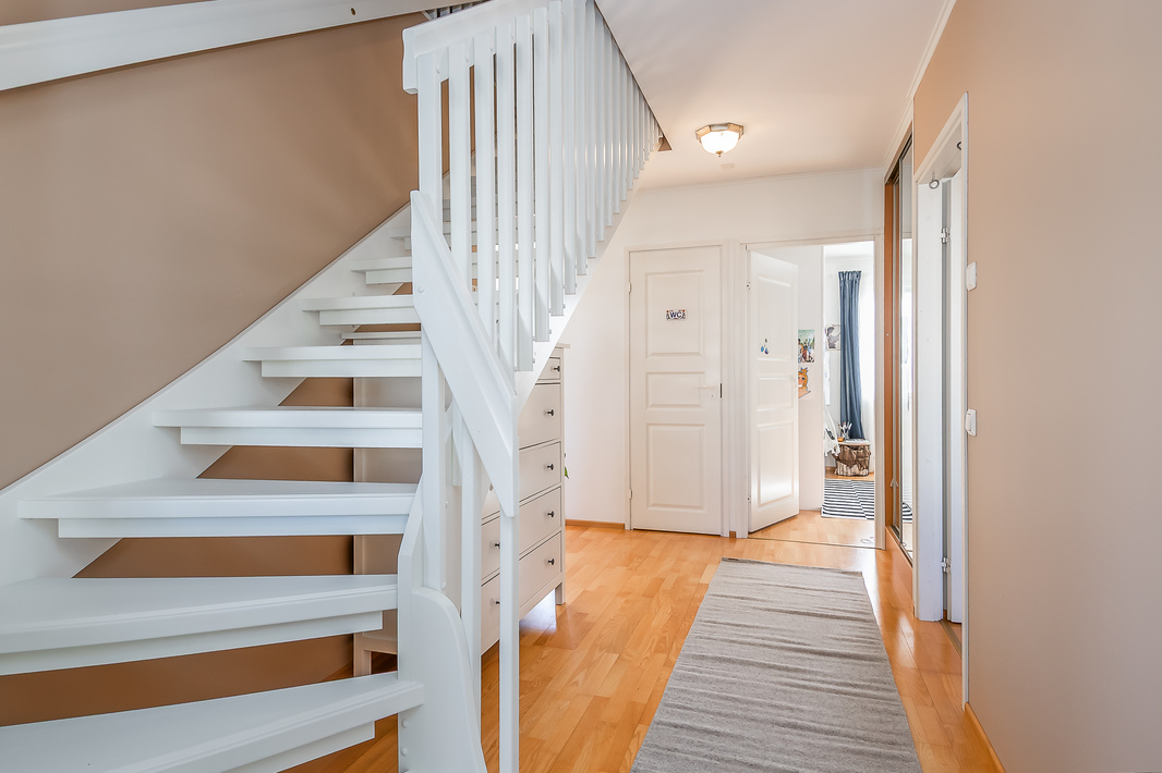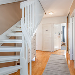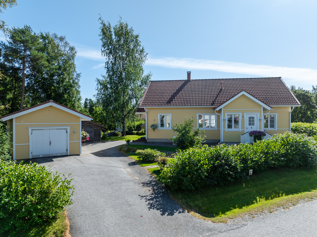 På nedre våningen förenas Puustelli-köket med vardagsrummet. Ackumulerande Tulikivi-spis. Rymligt klädvårsrum, bastuavdelning, separat WC och tre sovrum. Varm, ca 5 m² kvist.