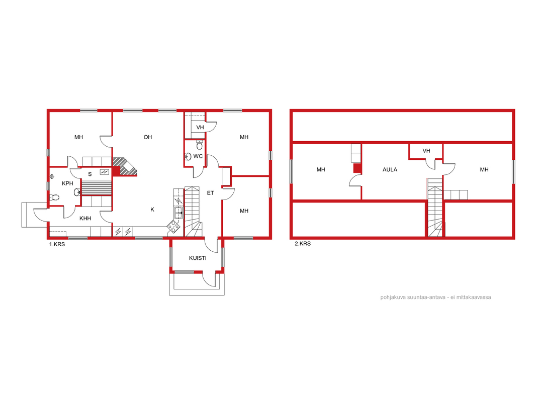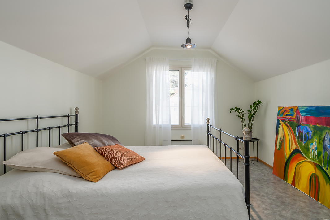 Yläkerrassa kaksi tilavaa makuuhuonetta, aulatila ja vaatehuone, johon on mahdollista tehdä erillinen WC. Viisi makuuhuonetta tarjoaa mahdollisuuden myös erillisiin työhuoneisiin.