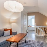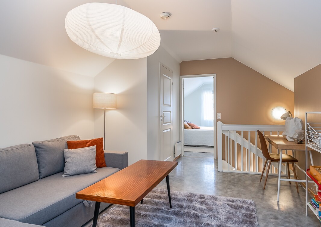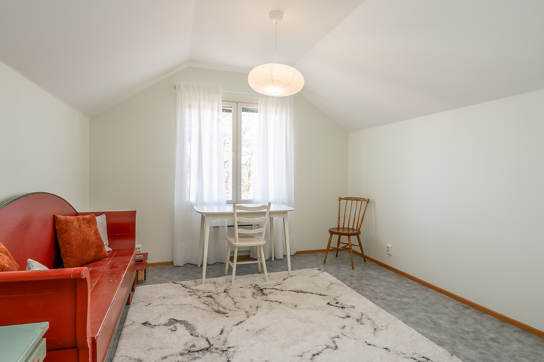 På övre våningen finns två rymliga sovrum, allrum och klädrum där det är möjligt att bygga en separat WC. De fem sovrummen ger även möjlighet till separata arbetsrum.