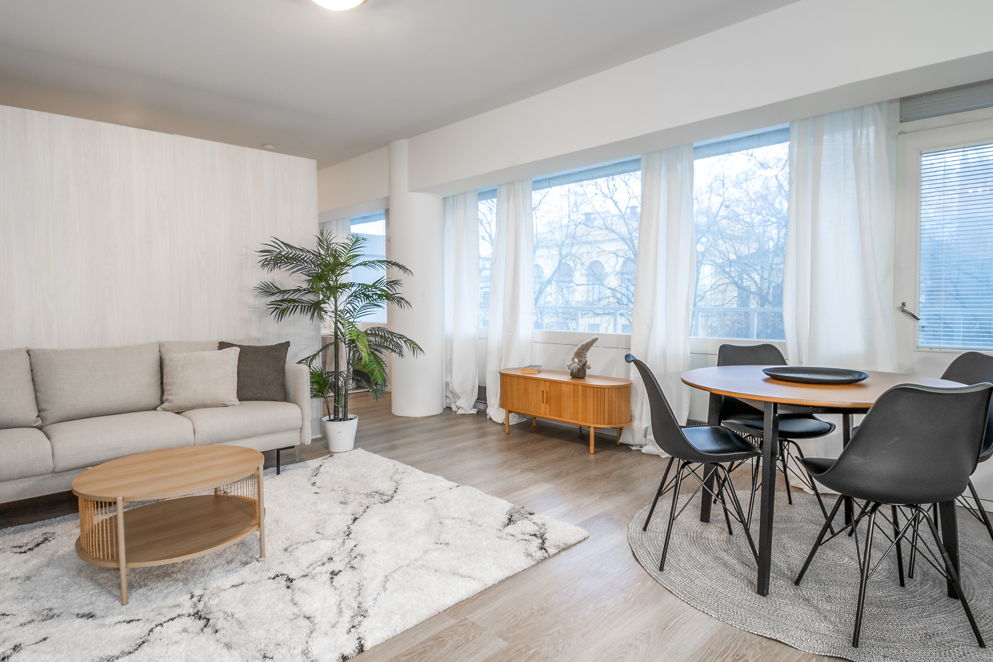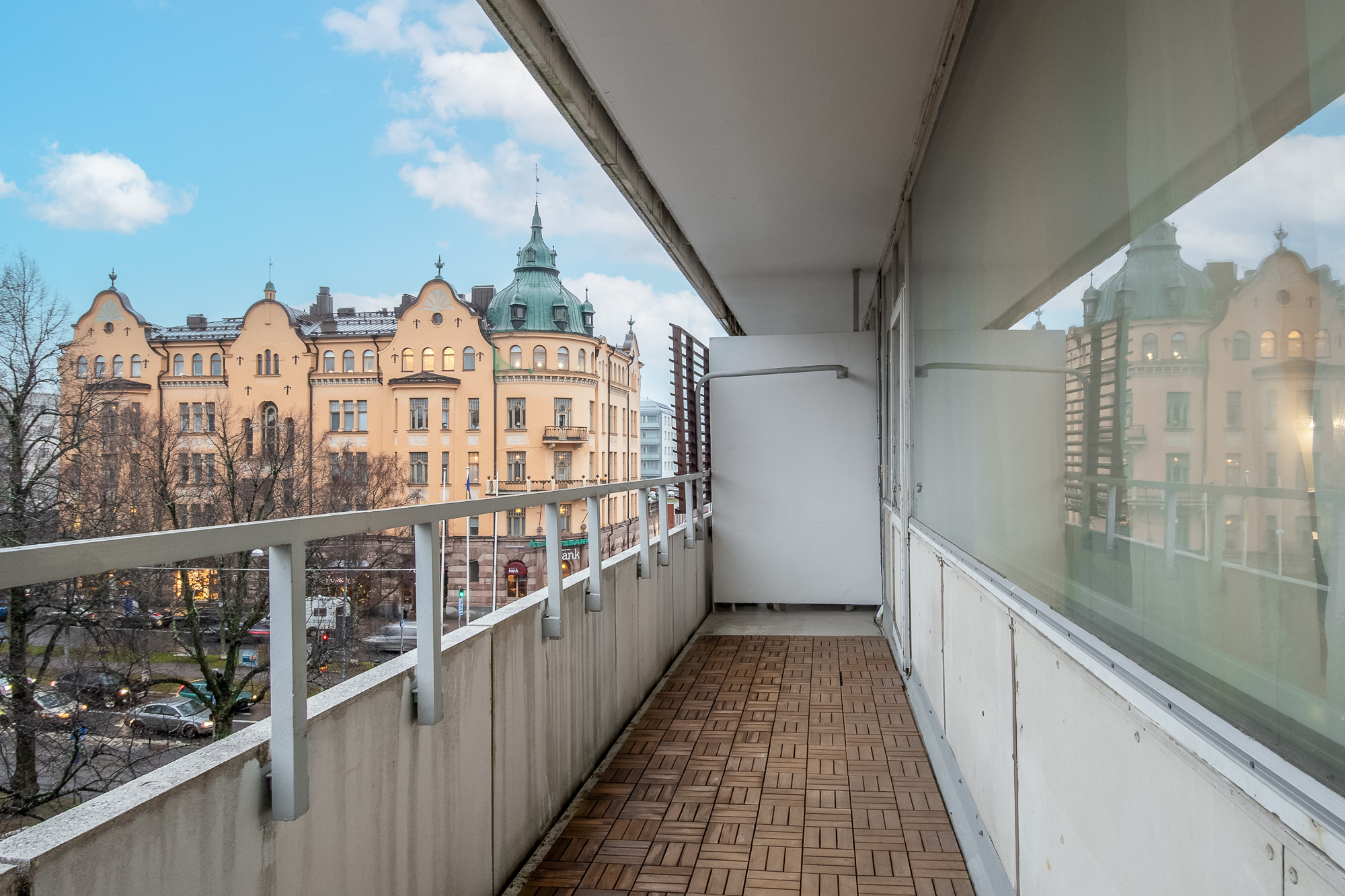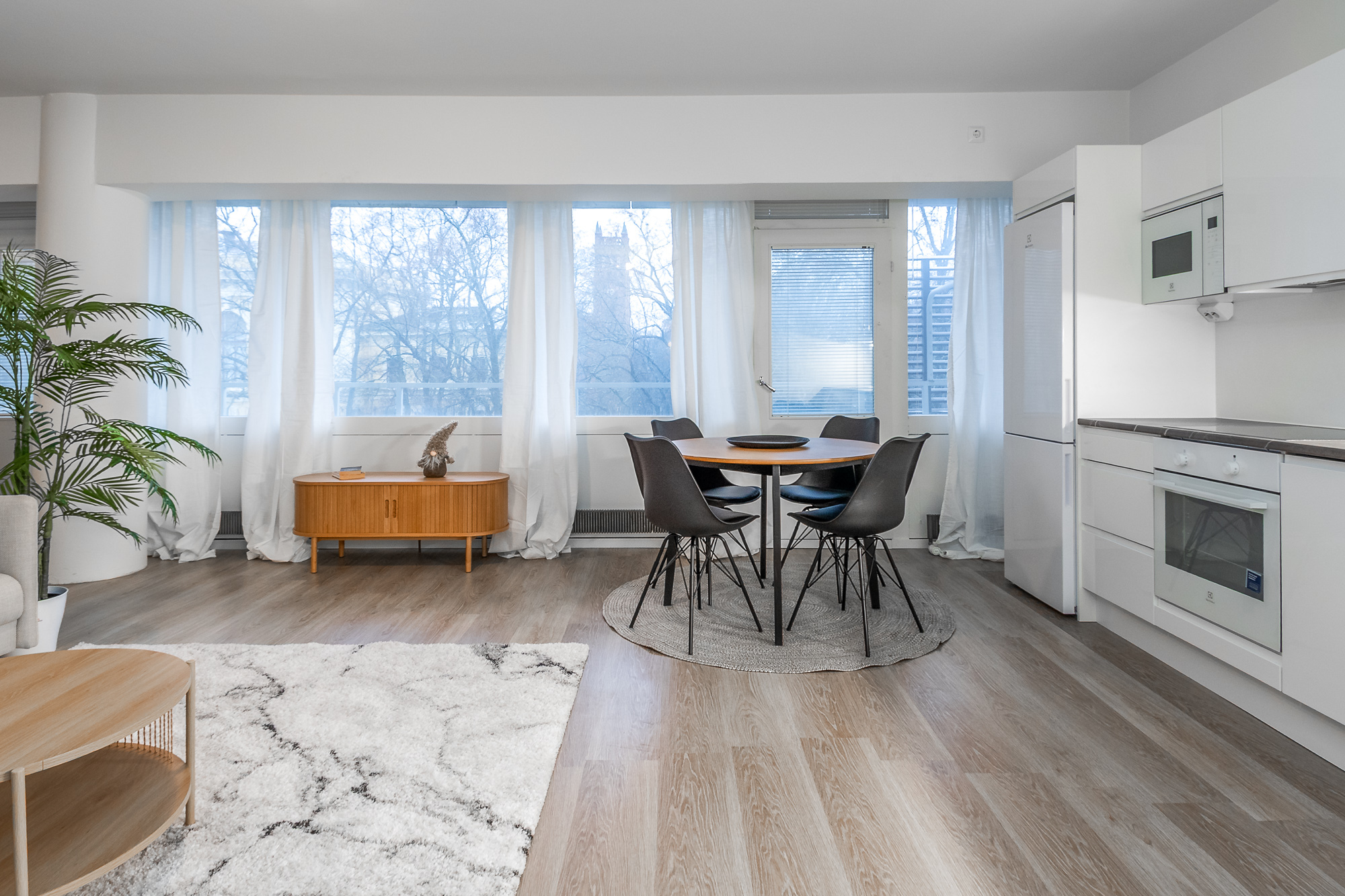 Loistavalla sijainnilla ydinkeskustassa – täysin remontoitu kaksio hissitalon viidennessä kerroksessa! Vuonna 2022 kokonaisuudessaan remontoitu asunto. Avara pohjaratkaisu yhdistää keittiön ja olohuoneen yhtenäiseksi ja viihtyisäksi oleskelutilaksi. Makuuhuoneessa on suuret liukuovikaapistot, joissa runsaasti säilytystilaa. Koko huoneiston levyinen (noin 8 m), länteen avautuva parveke tuo mukavasti lisätilaa. Kylpyhuoneessa on lattialämmitys, ja pesukone sisältyy kauppahintaan. Huoneistossa on ilmanviilennin kesähelteiden helpotukseksi. Taloyhtiö sijaitsee omalla tontilla. Asunto on heti vapaa! Utmärkt läge i stadens absoluta centrum – totalrenoverad tvåa på femte våningen i hus med hiss! Lägenheten totalrenoverades år 2022. Den öppna planlösningen förenar kök och vardagsrum till en trivsam och rymlig helhet. I sovrummet finns stora skjutdörrsgarderober med gott om förvaringsutrymme. Balkongen (ca 8 m) sträcker sig längs hela lägenheten och vetter mot väster, vilket ger extra utrymme. Badrummet är utrustat med golvvärme, och tvättmaskinen ingår i köpesumman. Bostadsbolaget står på egen tomt. Lägenheten är genast ledig!