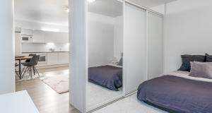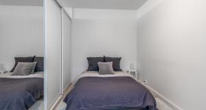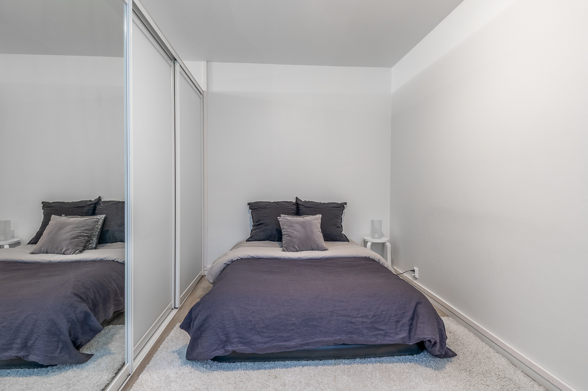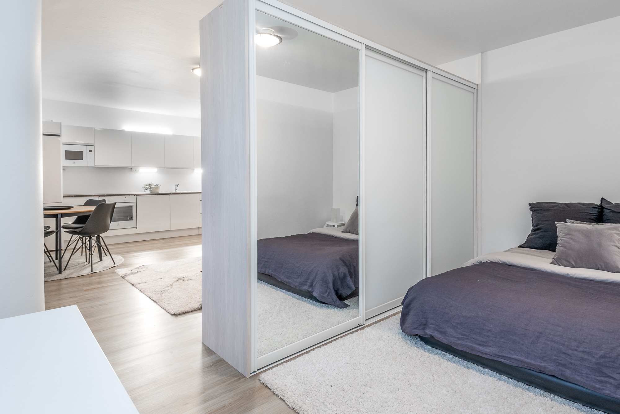 Makuuhuoneessa isot liukuovikaapistot ja erillinen kulku parvekkeelle.