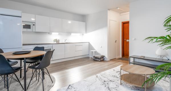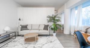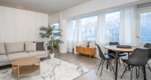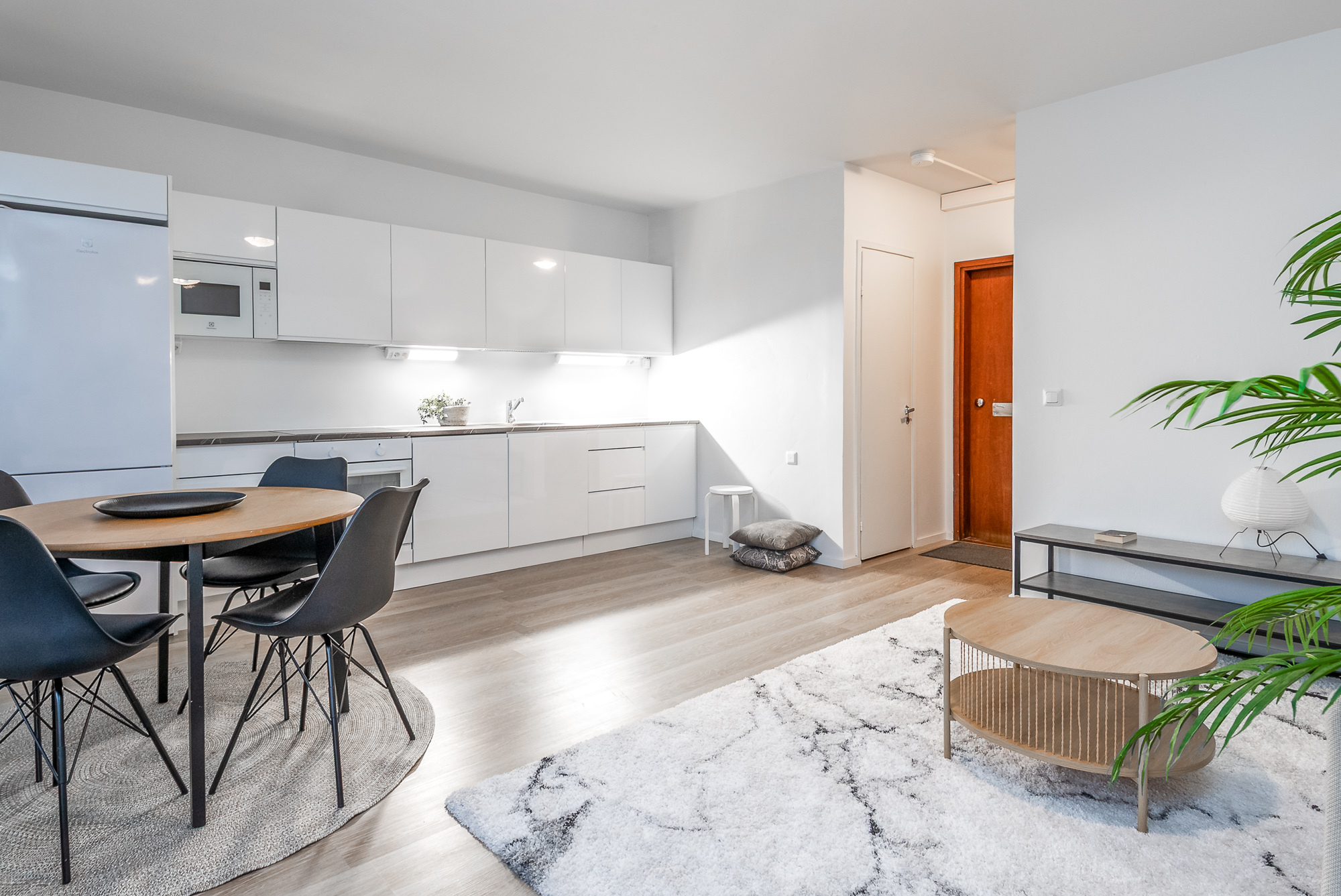 Tyylikäs, tilava keittiö olohuoneen yhteydessä. Täysin remontoitu vuonna 2022. Induktioliesi, liesituuletin, jääkaappi, pakastin, integroitu astianpesukone, mikroaaltouuni.