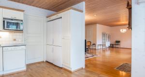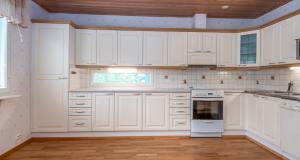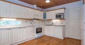 Valoisa, iso keittiö jossa hiljattain uusittu lattia. Liesi, liesituuletin, astianpesukone, mikroaaltouuni