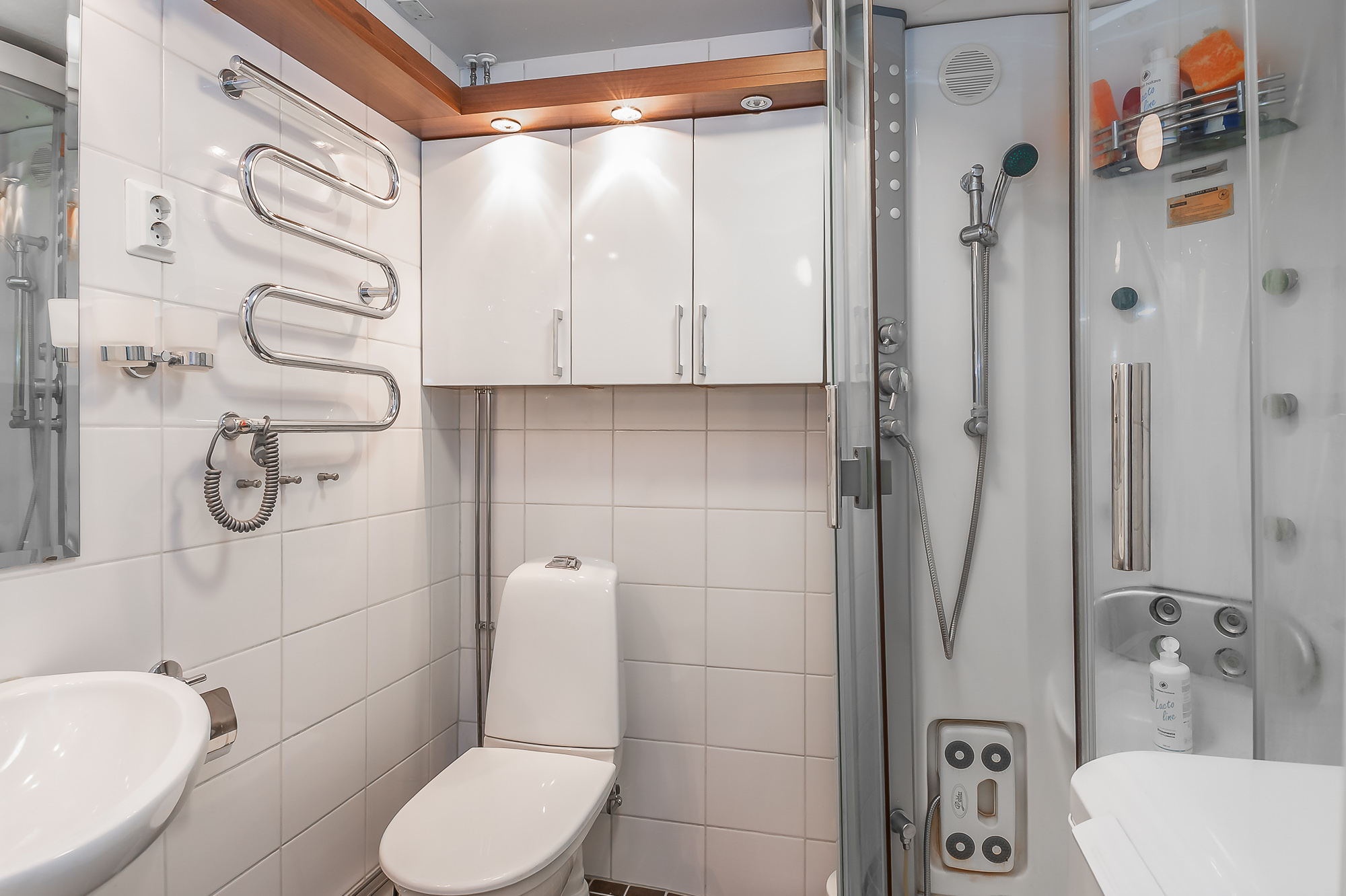 Vuonna 2011 remontoitu kylpyhuone. Suihkukaappi, pesukoneliitäntä. Lattialämmitys.