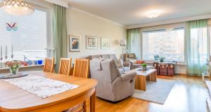 Olohuoneessa tilaa isollekin ruokapöydälle – kulku huoneesta lasitetulle länsiparvekkeelle. Valoisa keittiö yhteydessä olohuoneeseen. Kolme makuuhuonetta. Keittiössä, kylpyhuoneessa, wc:ssä ja eteisessä laattalattia lattialämmityksellä.