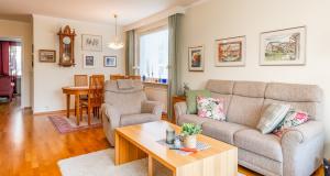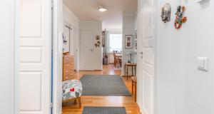 Vardagsrummet har plats för ett stort matbord och utgång till den inglasade västbalkongen. Ljust kök i anslutning till vardagsrummet. Tre sovrum. I köket, badrummet, wc:n och entrén finns klinkergolv med golvvärme.