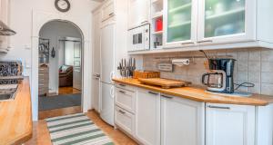 Jääkaappi/pakastin, liesitaso, erillisuuni, liesituuletin, astianpesukone, mikroaaltouuni. Laattalattia ja lattialämmitys.