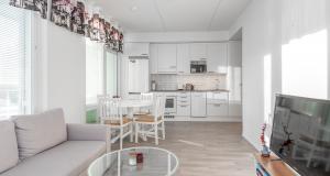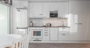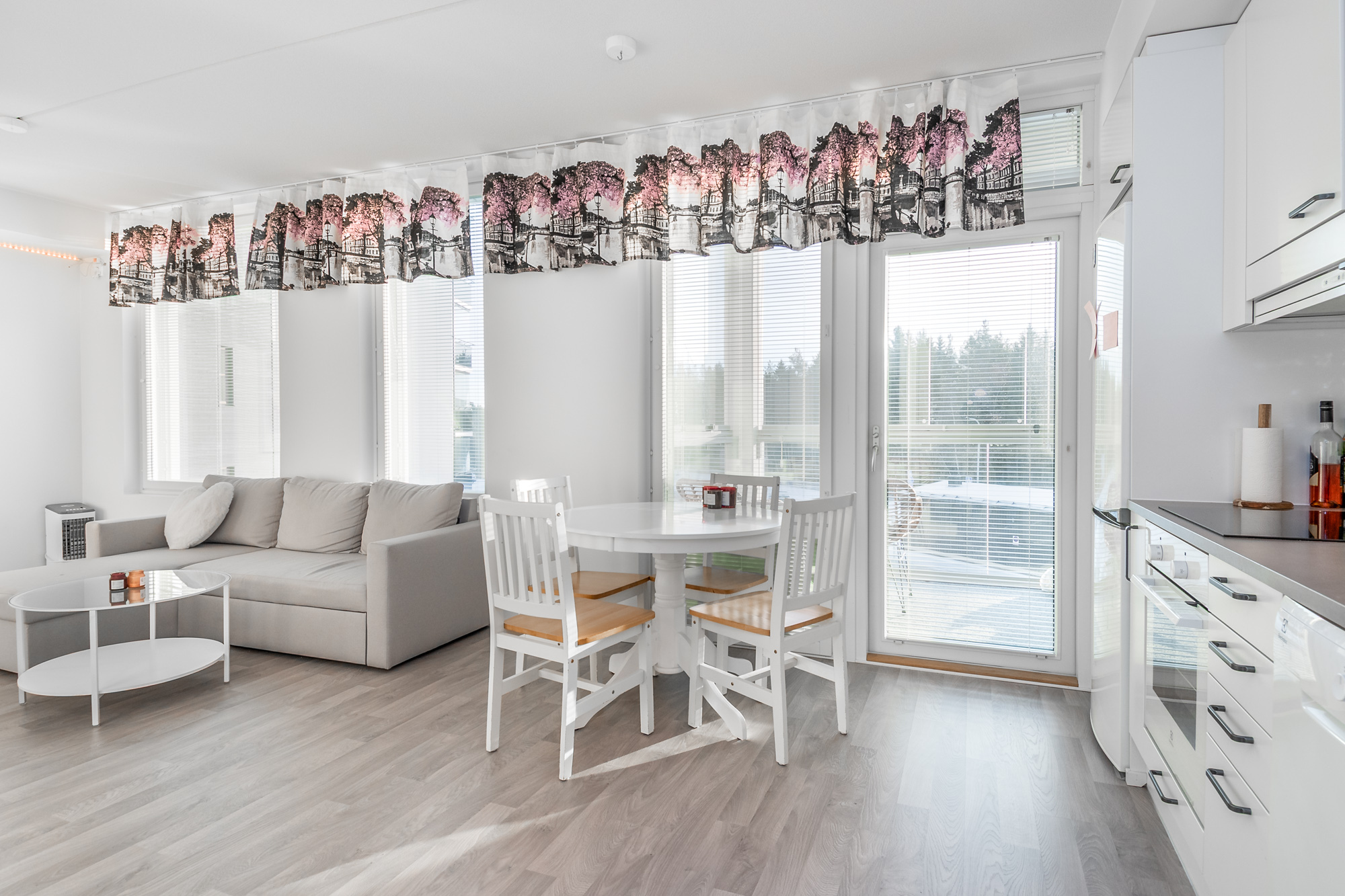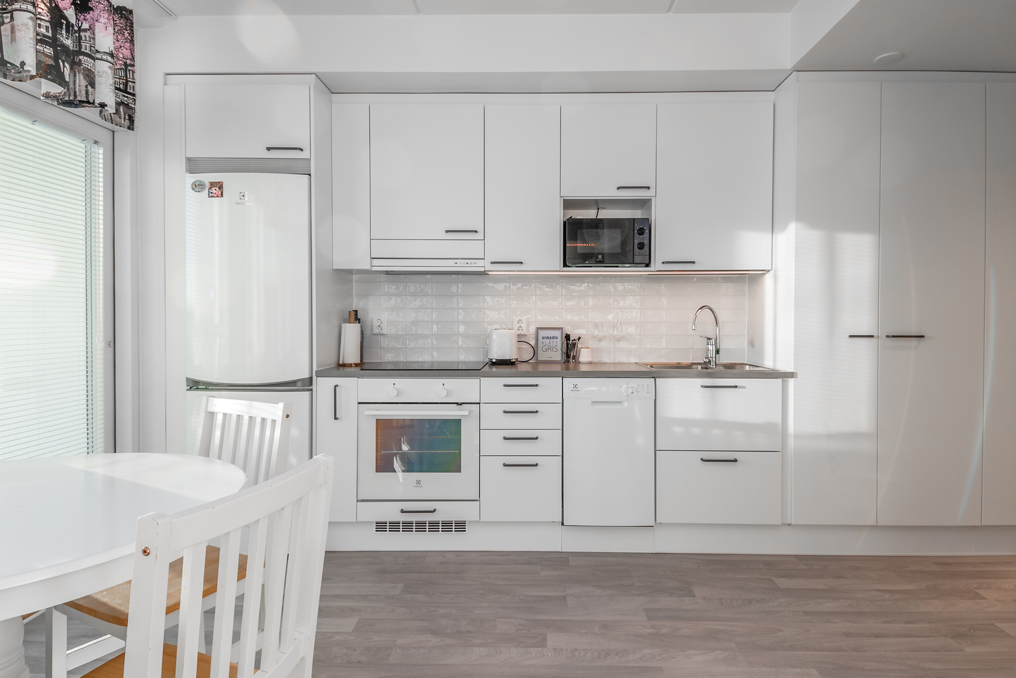Keittiö ja olohuone yhtä tilaa. Jääpakastinkaappi, induktioliesi, liesituuletin, kalusteuuni, astianpesukone.