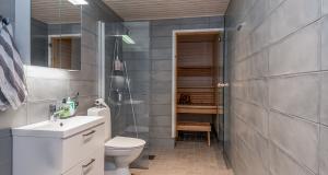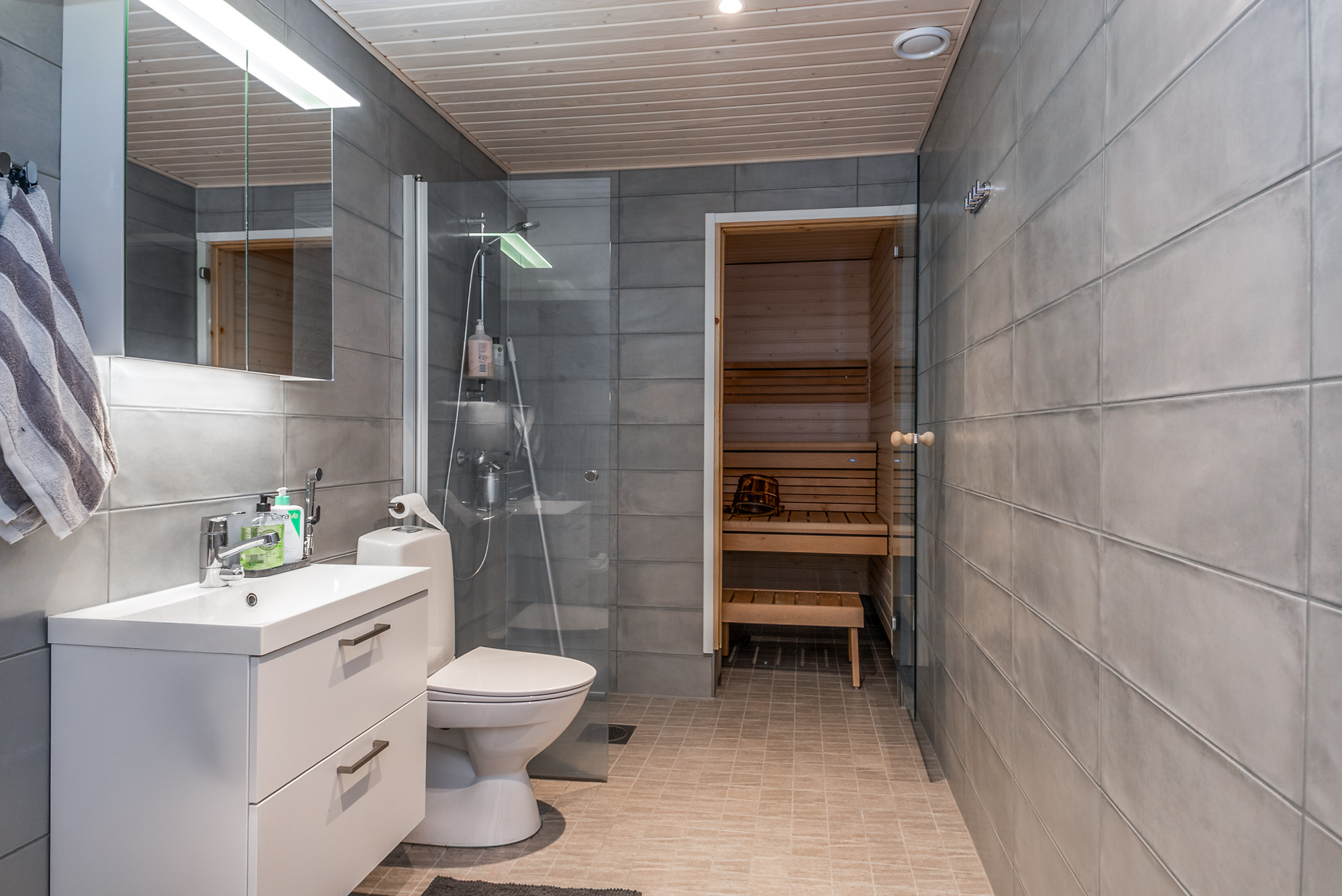 Tilava kylpyhuone oman saunan yhteydessä. Tilaa pesutornille.