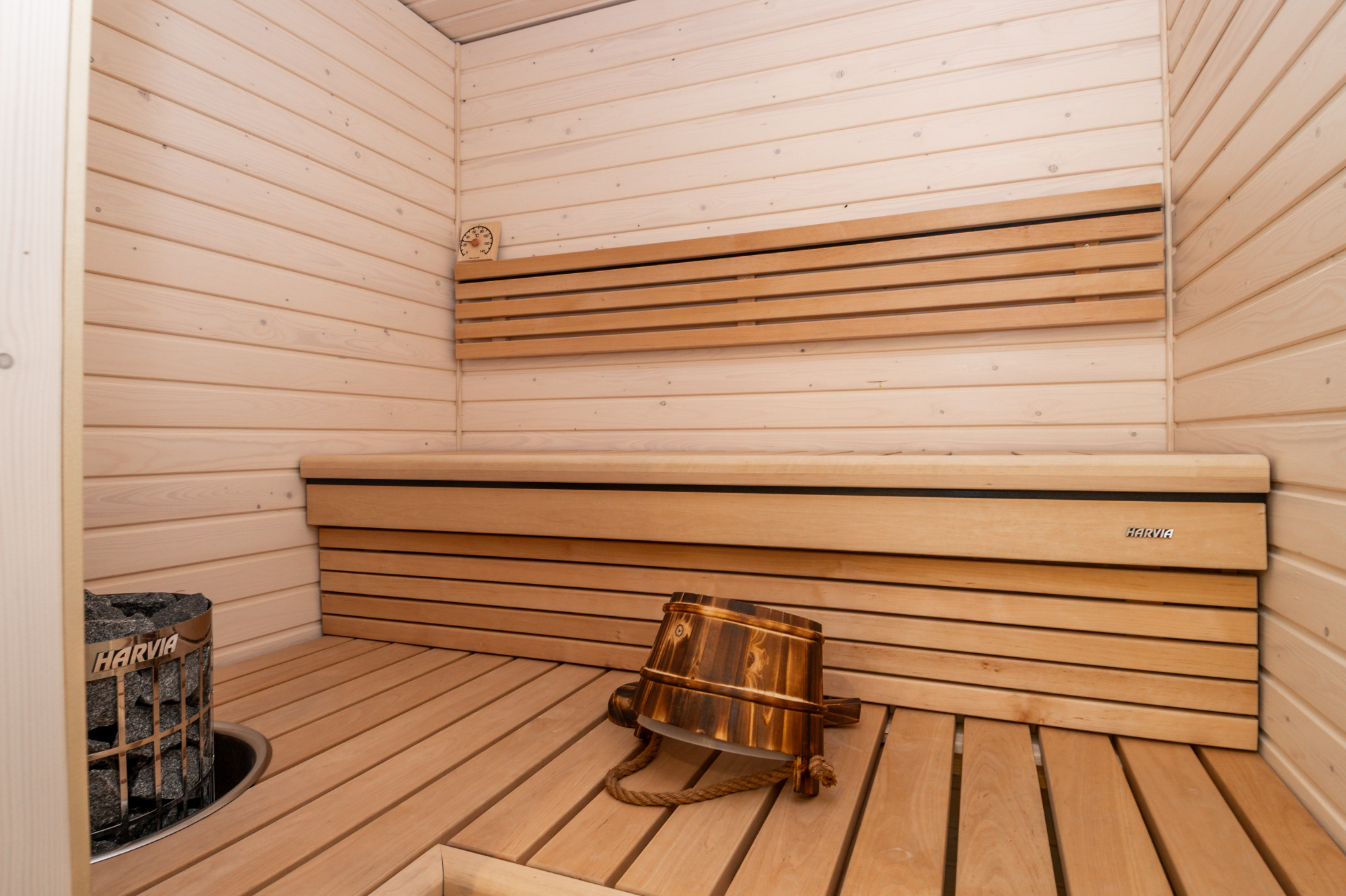 Hela lägenheten har vattenburen golvvärme (inga batterier på väggarna) och lägenhetsspecifik ventilation med värmeåtervinning. Rymligt badrum med egen bastu, rum för ett tvättorn.