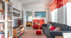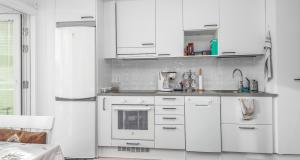 Keittiö ja olohuone yhtä tilaa. Jääpakastinkaappi, induktioliesi, liesituuletin, kalusteuuni, astianpesukone.