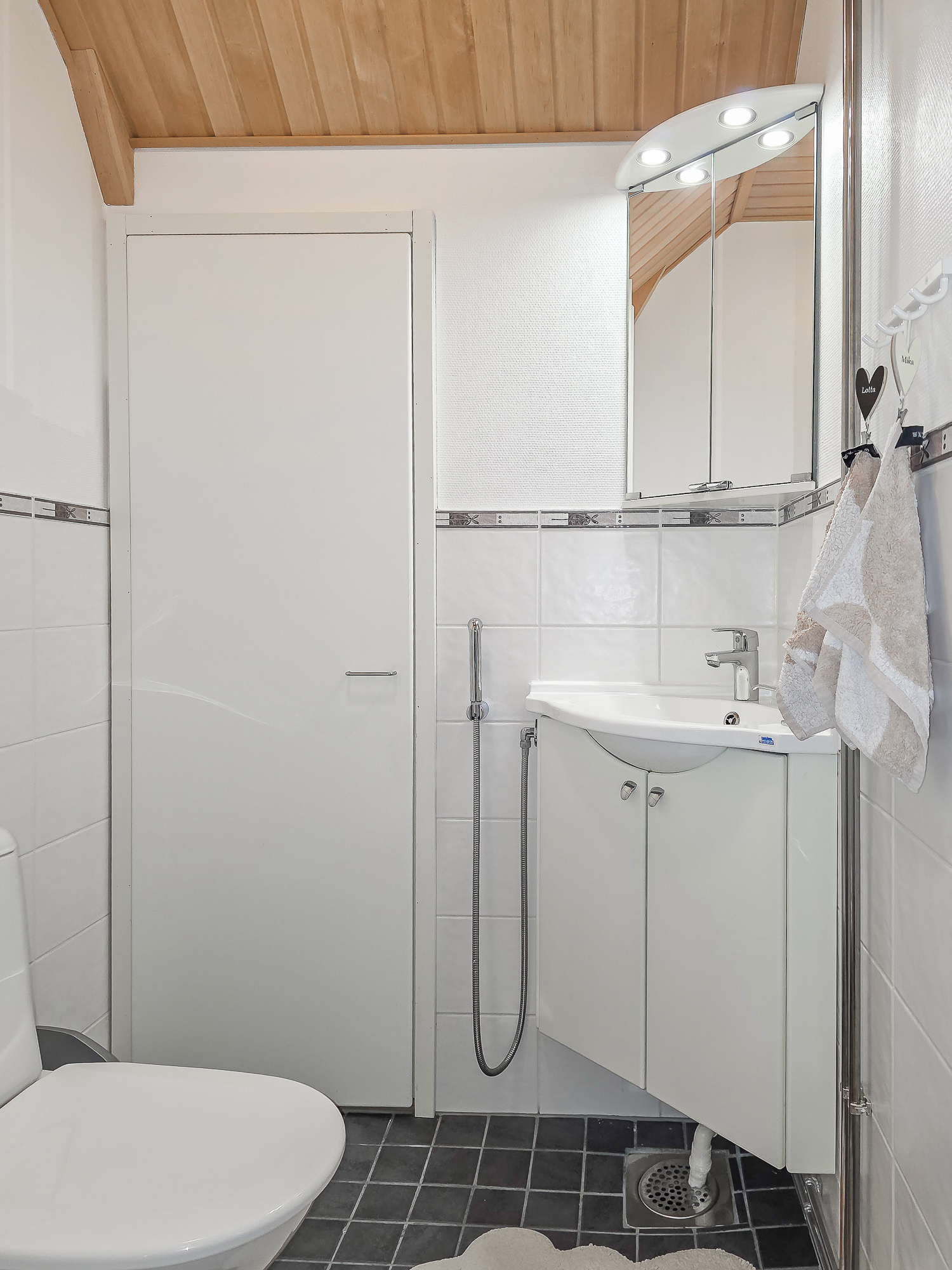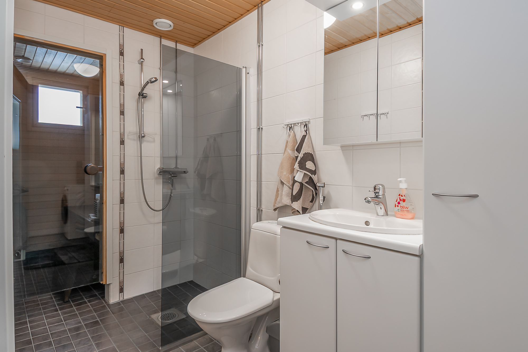 Tilava kylpyhuone saunan yhteydessä. Suihkuseinä uusittu. Tilaa pesutornille. Lattialämmitys.