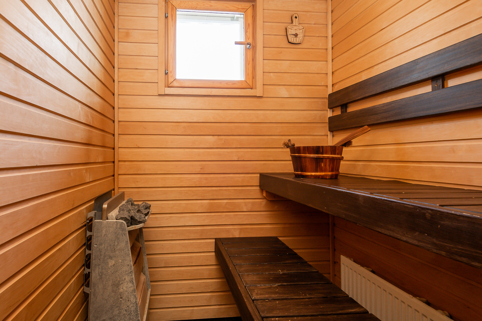 Yläkerrassa kaksi makuuhuonetta sekä kylpyhuone, jonka yhteydessä sauna. Kylpyhuoneessa, erillisessä wc:ssä sekä eteisessä lattialämmitys.