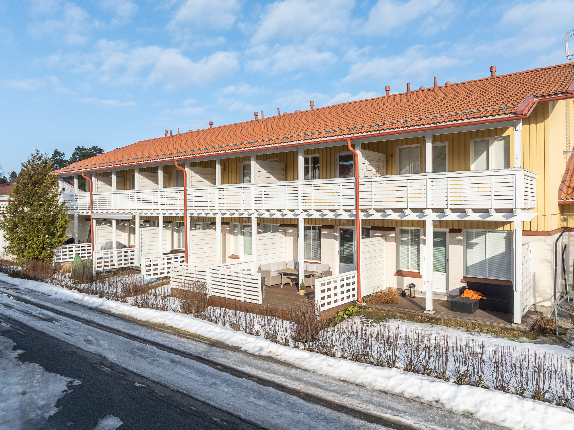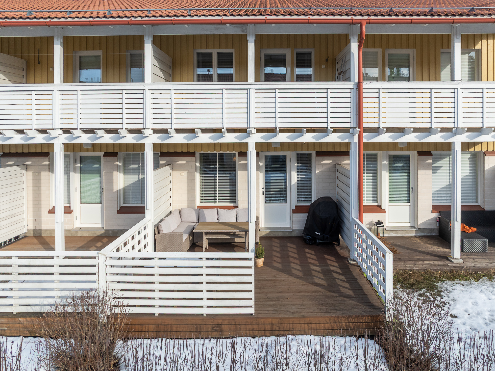 Från vardagsrummet finns utgång till en egen terrass i västerläge, och från huvudsovrummet finns utgång till en balkong mot väster.