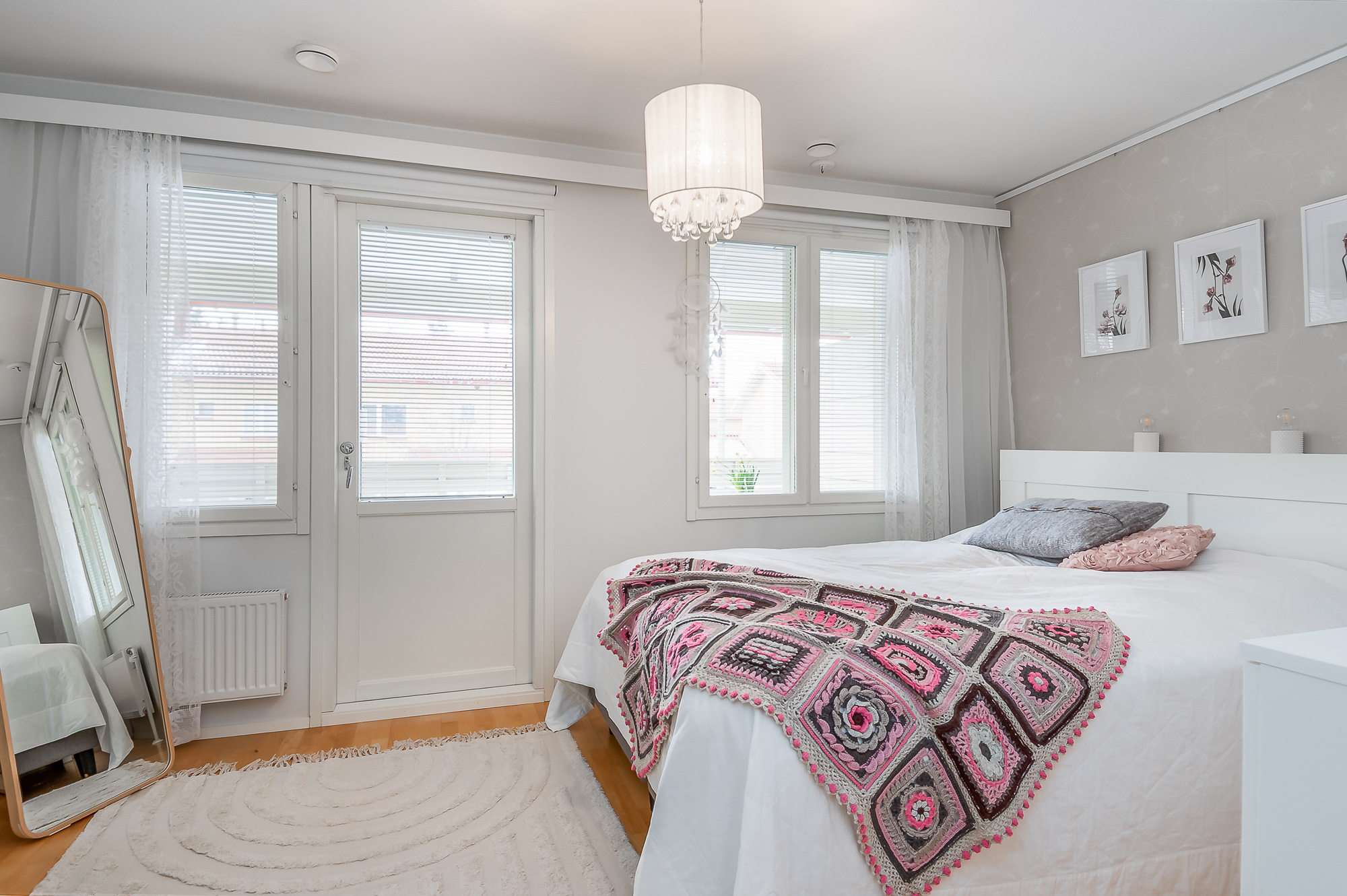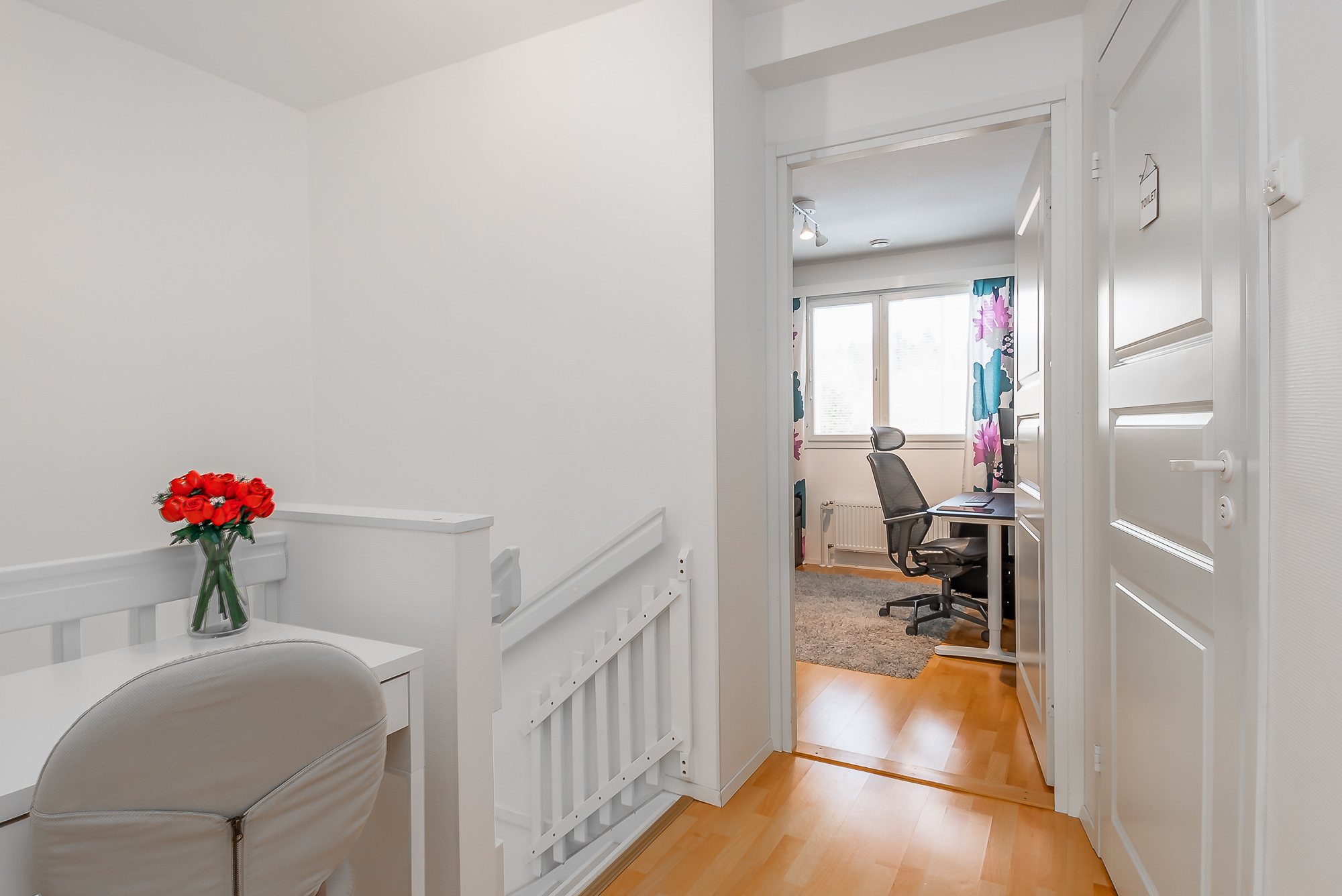 Yläkerrassa kaksi makuuuonetta, molemmissa vaatekaapistot. Päämakuuhuoneesta kulku länsiparvekkeelle.