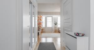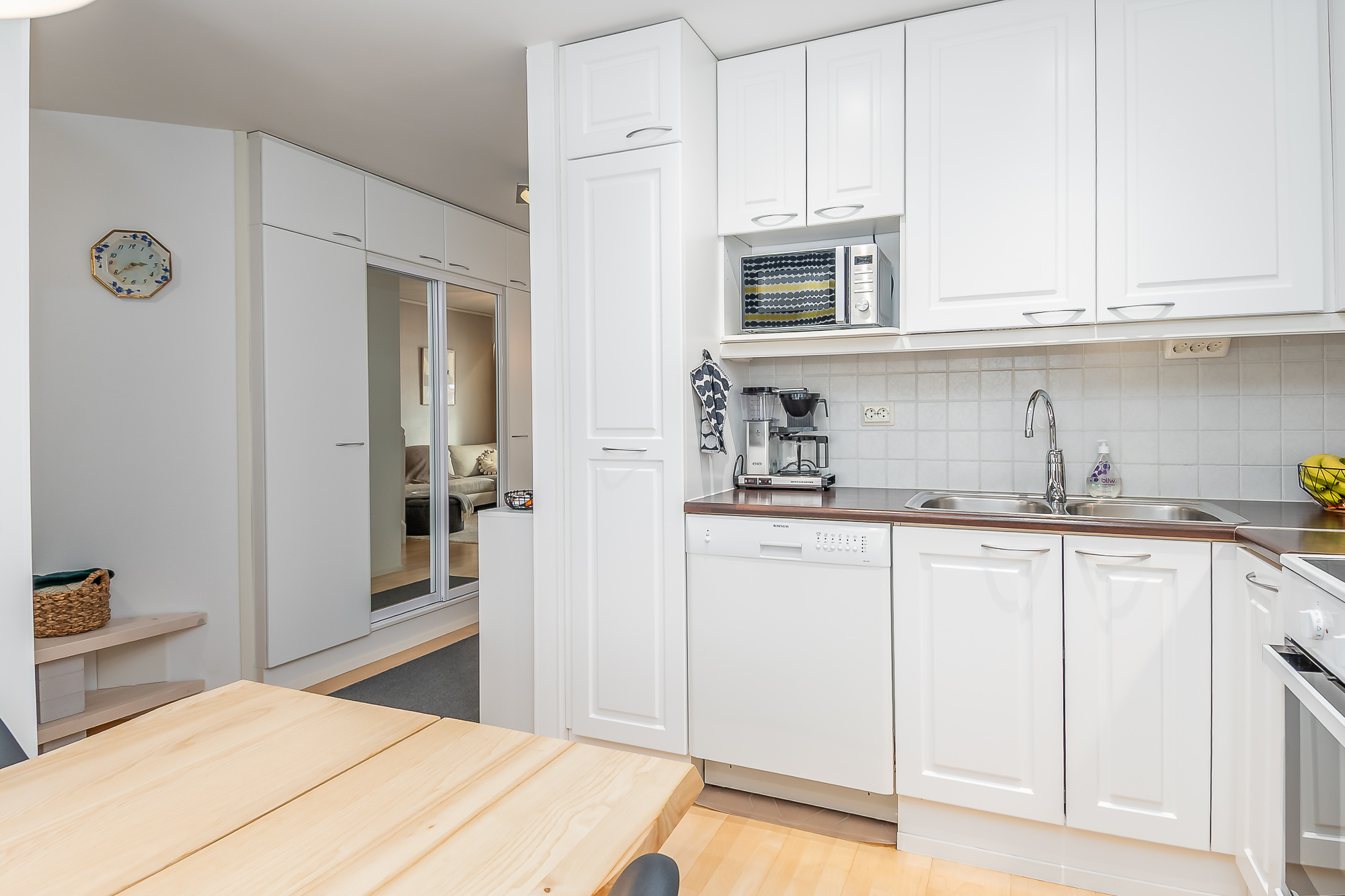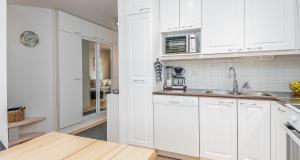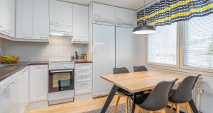 Keittiötä on päivitetty viime vuosien aikana – induktioliesi ja liesituuletin on uusittu ja kaapinovet on juuri maalattu.