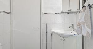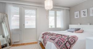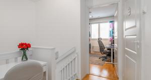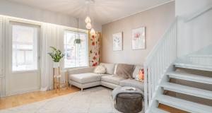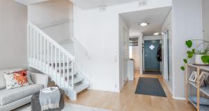 Köket har uppdaterats under de senaste åren – induktionsspis och spisfläkt har förnyats och skåpdörrarna har nyligen målats. På övre våningen finns två sovrum samt ett badrum med bastu. I badrummet, den separata WC:n samt i tamburen finns golvvärme.