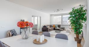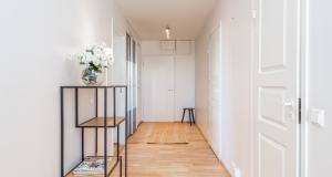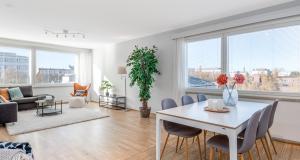 Lägenheten har ett stort vardagsrum och tre sovrum, varav två är ovanligt rymliga och kan till exempel användas som matsal, då de är förbundna med vardagsrummet genom stora dörröppningar. Även vardagsrummet rymmer en stor matgrupp, och i köket finns plats för ett köksbord.