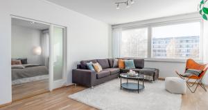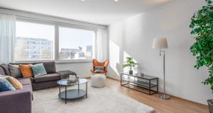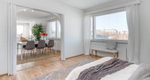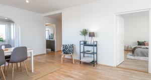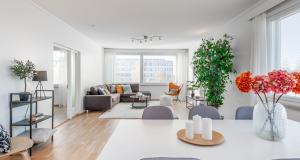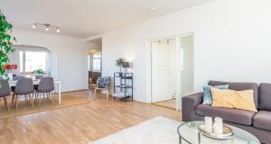 Asunnossa on iso olohuone ja kolme makuuhuonetta, joista kaksi ovat huomattavan isoja ja käytettävissä myös esimerkiksi ruokasalina, koska ne yhdistyvät olohuoneeseen isojen oviaukkojen kautta. Olohuoneeseenkin mahtuu hyvin isokin ruokailuryhmä ja keittiössä on tilaa arkiruokapöydälle.
