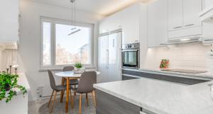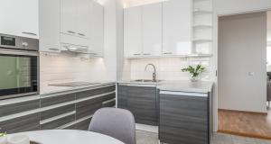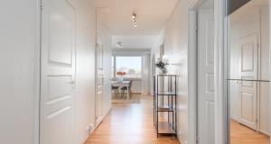Korkeat jää- ja pakastinkaapit, integroitu uuni, keraaminen liesi, liesituuletin, integoritu astianpesukone.