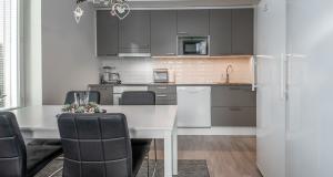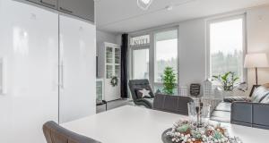 Keittiö ja olohuone yhtä tilaa. Korkeat jää- ja pakastinkaapit, induktioliesi, liesituuletin, kalusteuuni, astianpesukone.