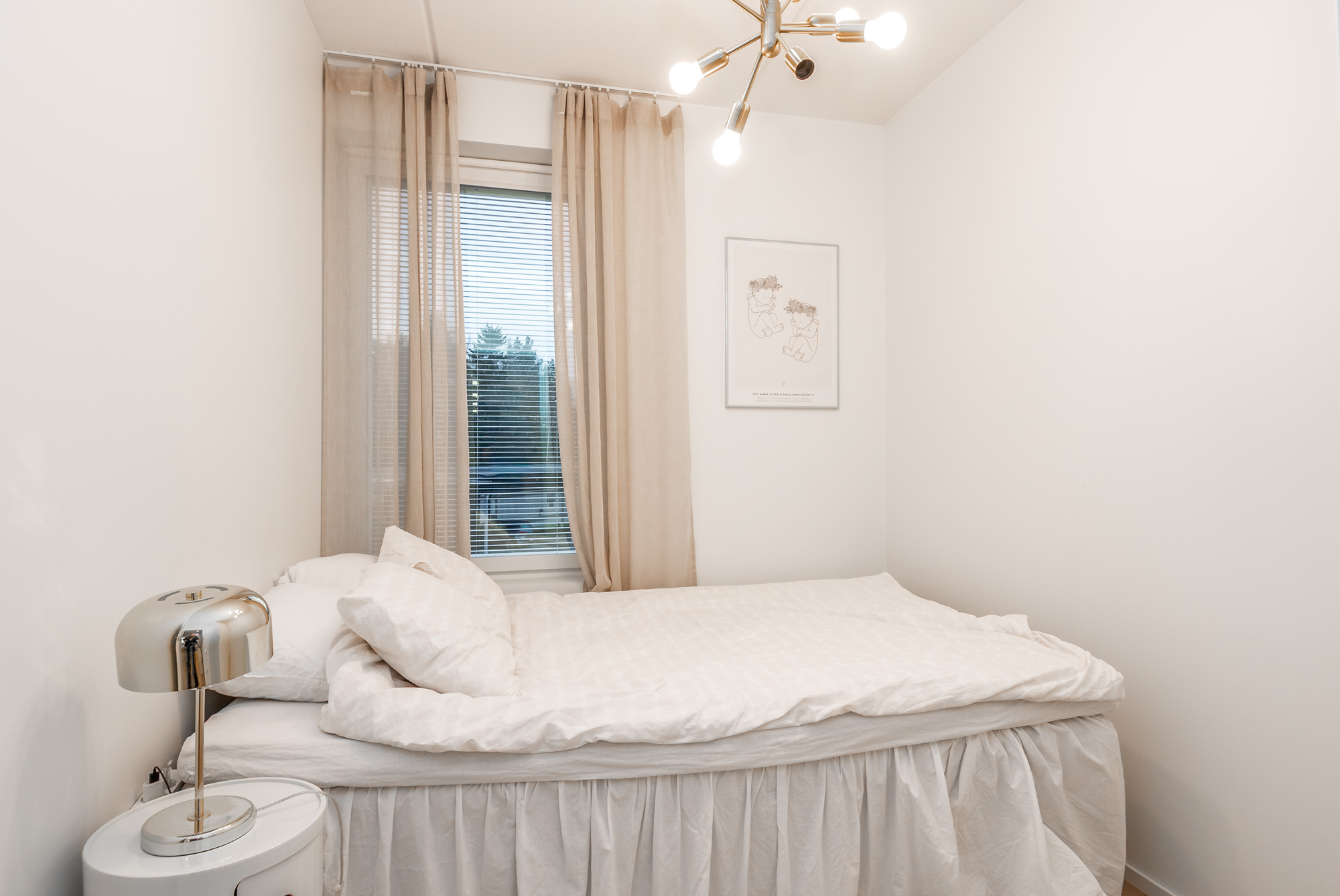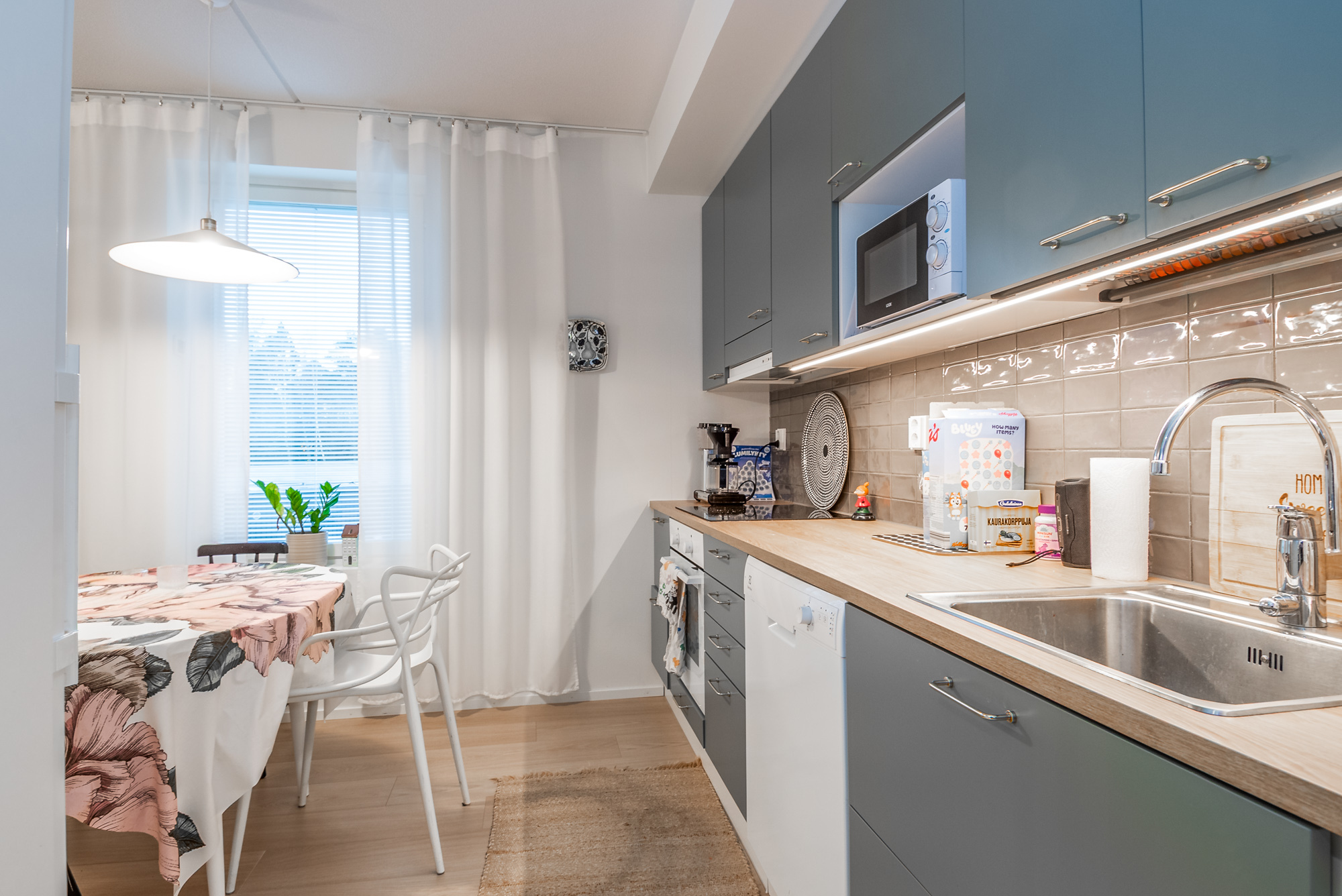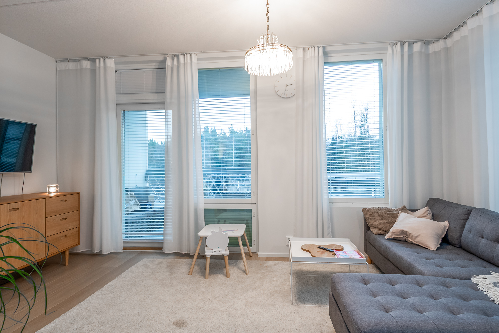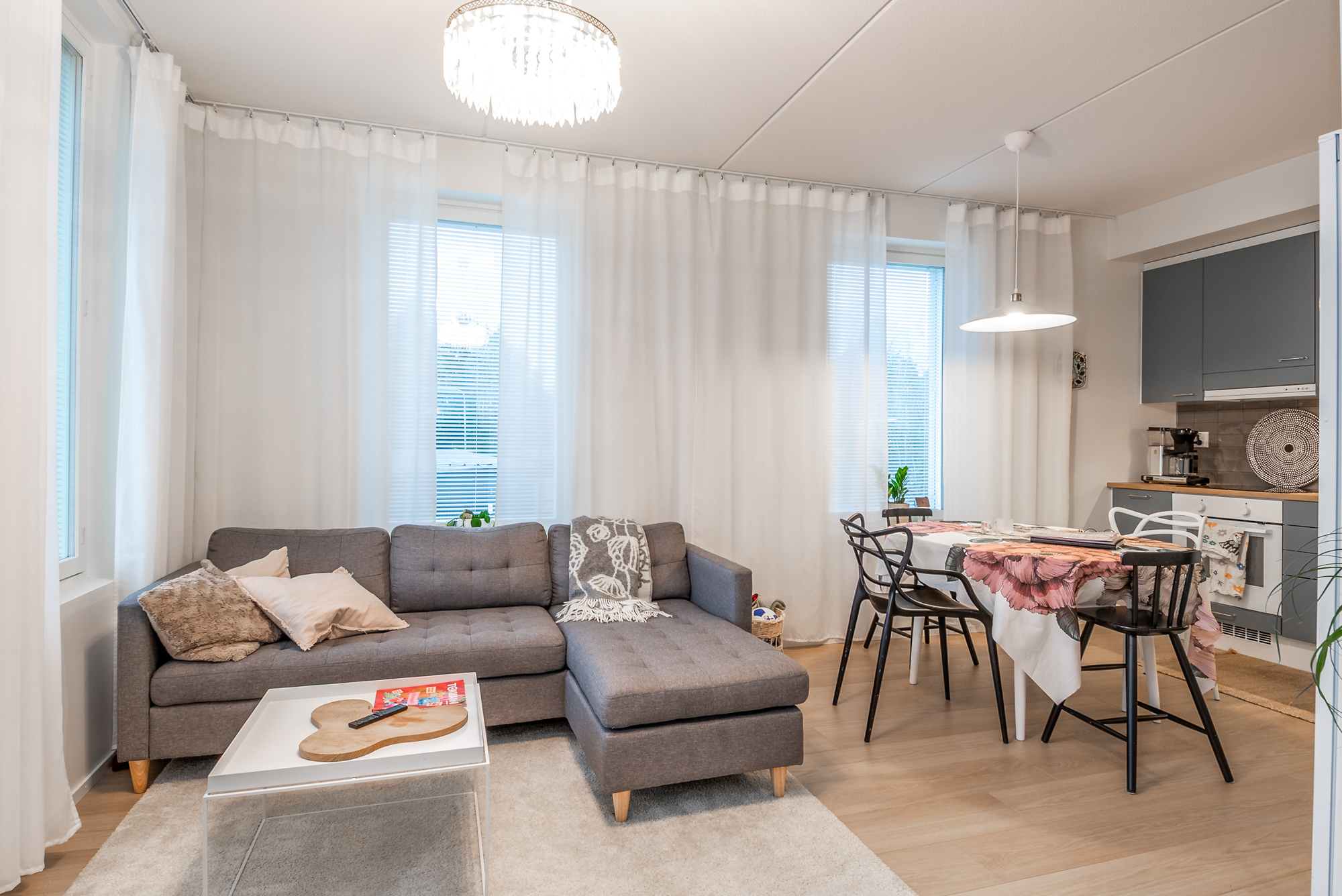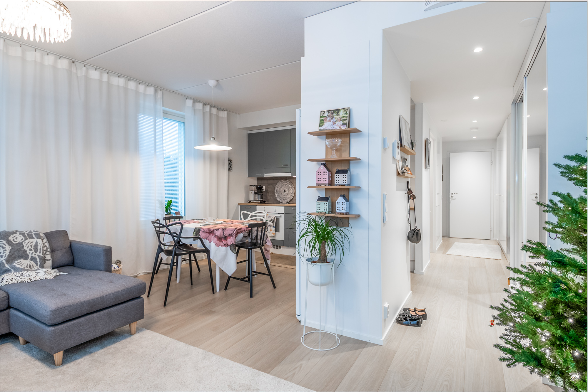 Uutta vastaava kolmio Melaniemessä vuonna 2023 valmistuneessa taloyhtiössä. Erittäin valoisa 2. kerroksen päätyasunto, missä keittiö ja olohuone ovat yhtä, avaraa tilaa ja ikkunoita kolmeen eri ilmansuuntaan. Olohuoneesta käynti lasitetulle parvekkeelle. Koko asunnossa on vesikiertoinen lattialämmitys (ei pattereita seinillä) ja huoneistokohtainen ilmanvaihto lämmön talteenotolla. Oman saunan yhteydessä kylpyhuone, missä on tilaa pesutornille. Taloyhtiön yhteiset tilat ovat niin ikään uudenveroiset - asuminen tässä talossa on huoletonta. Kulkuyhteydet ovat loistavat eri puolille kaupunkia. Ajomatka keskustaan vain noin 5 min. Alueella on myös upeat ulkoilumahdollisuudet. Asunto on vuokrattu. Mahdollisuus ostaa autokatospaikka ja/tai sähkötolppapaikka eri osakkeina. Myynnissä myös 3. kerroksen vastaava asunto, jonka velaton hinta 139 000 euroa. Som ny trea i ett bostadsbolag som färdigställs i Melmo 2023. En mycket ljus gavellägenhet på andra våningen, med kök och vardagsrum i gemensamt öppet utrymme. Fönster i tre olika väderstreck. Från vardagsrummet tillgång till den inglasade balkongen. Hela lägenheten har vattenburen golvvärme (inga element på väggarna) och lägenhetsspecifik ventilation med värmeåtervinning. Egen bastu i gemensamt utrymme som badrummet, rum för ett tvättorn. Bostadsbolagets gemensamma utrymmen är också lika nya, vilket gör det bekymmersfritt att bo i detta hus. Transportförbindelserna till olika delar av staden är utmärkta. Stadens centrum ligger bara cirka 5 minuters bilresa bort. Området erbjuder också fina möjligheter till friluftsliv. Lägenheten är uthyrd. Det finns möjlighet att köpa en biltakplats och/eller en elstolpplats för separata aktier. En liknande lägenhet på tredje våningen är också till salu: Skuldfritt pris 139 000 €.
