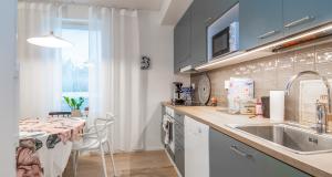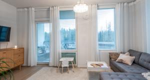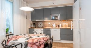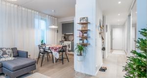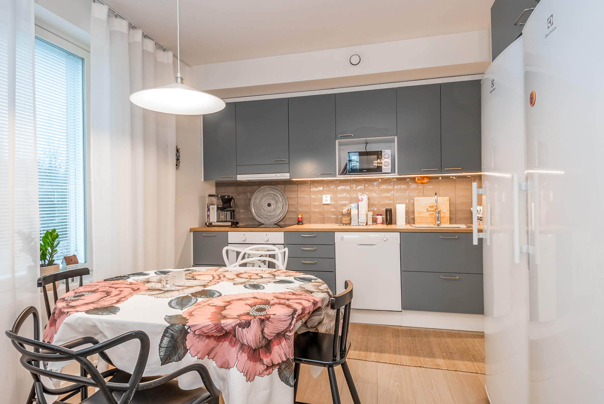 Keittiö ja olohuone yhtä tilaa. Korkeat jää- ja pakastinkaapit, induktioliesi, liesituuletin, kalusteuuni, astianpesukone.