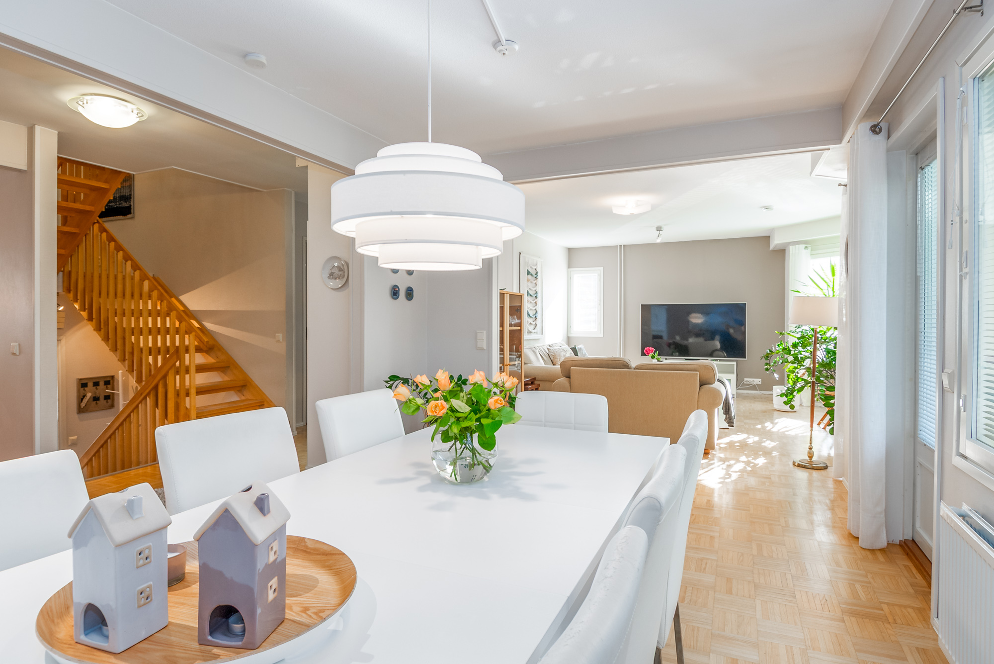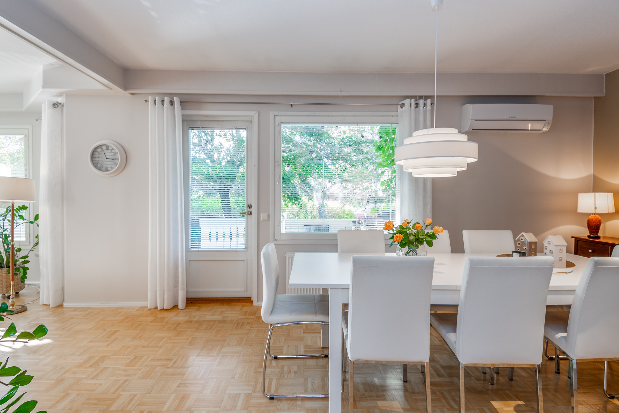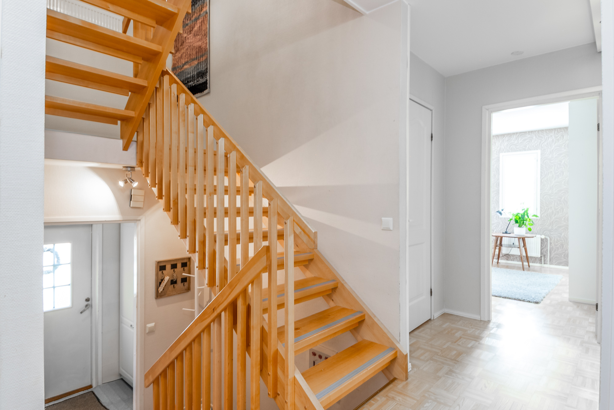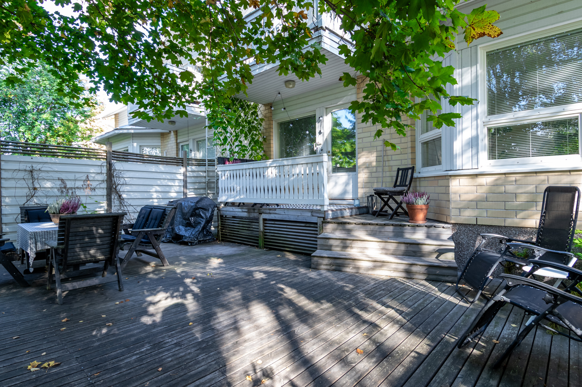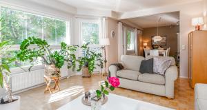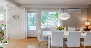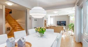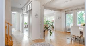 Erittäin tilava paritaloasunto asunto-osakeyhtiömuotoisessa taloyhtiössä Huutoniemellä kattavien palveluiden äärellä! Tilat jakautuvat kolmeen kerrokseen, joista keskikerroksessa oleskelutilat muodostavat yhdessä keittiön kanssa todella ison ja avaran yhteisen tilan. Olohuoneesta kulku pienen parveketasanteen kautta omaan, suojaisaan puutarhaan, joka avautuu lounaan suuntaan. Puutarhasta myös kulku autotallille sekä taloyhtiön isolle parkkialueelle. Makuuhuoneista yksi on alakerrassa ja kolme yläkerrassa. Kaikki makuuhuoneet ovat tilavia - osa jopa erittäin tilavia. Kellarikerroksessa on takkahuone, jota voi käyttä esim vieras- tai työhuoneena. Asunnossa on loistavat pesutilat; ylä- ja alakerrassa on tilavat kylpyhuoneet, joissa molemmissa on suihku. Saunatilat ovat kellarikerroksessa, samoin kuin erillinen kodinhoitohuone ja tilava, lämmin varastohuone. Kaikissa pesutiloissa ja koko kellarikerroksessa on vesikiertoinen lattialämmitys. Taloyhtiö on omalla tontilla ja kaukolämmössä. Vastike on erittäin edullinen - ainoastaan 387 e/kk sisältäen jopa vesimaksun ja luonnollisesti kaikki muut yhtiölle kuuluvat maksut. Asunnolle kuuluu lämmin autotalli ja kaksi autopaikkaa autotallin edessä - näillä paikoilla sähköauton latausasemat. Taloyhtiön tontilla on lisäksi iso, asfaltoitu parkkialue, missä on tilaa säilyttää monenlaisia ajoneuvoja, veneitä tai peräkärryjä. Vastaavanlaisia isoja asuntoja on harvoin tarjolla. Varainsiirtovero vain 1,5 %! En mycket rymlig parhuslägenhet i ett bostadsbolag i Roparnäs, nära till all service! Rummen är fördelade på tre våningar, med vardagsrum på mellanvåningen som tillsammans med köket bildar ett riktigt stort och rymligt gemensamt utrymme. Från vardagsrummet utgång via en liten balkong till en privat, skyddad trädgård som vetter mot sydväst. Från trädgården även tillgång till garaget och bostadsbolagets stora parkeringsplats. Ett av sovrummen ligger på nedervåningen och tre på övervåningen. Alla sovrum är rymliga, vissa till och med mycket rymliga. I källaren finns ett rum med öppen spis som kan användas t.ex. som gästrum eller arbetsrum. Lägenheten har utmärkta tvättmöjligheter; det finns rymliga badrum på både övre och nedre våningen, båda med dusch. Bastufaciliteterna finns i källaren, liksom ett separat tvättrum och ett rymligt, uppvärmt förråd. Alla badrum och hela källaren har vattenburen golvvärme. Bostadsbolaget ligger på en egen tomt och har fjärrvärme. Vederlaget är mycket förmånligt – endast 387 euro/månad, inklusive vattenavgifter och naturligtvis alla andra avgifter som ska betalas till bolaget. Till lägenheten hör ett uppvärmt garage och två parkeringsplatser framför garaget – dessa platser har ladd stationer för elbilar. Bostadsbolagets tomt har också en stor, asfalterad parkeringsplats med plats för förvaring av olika typer av fordon, båtar eller släpvagnar. Lägenheter i denna storlek finns sällan till salu. Överlåtelseskatt endast 1,5 %!