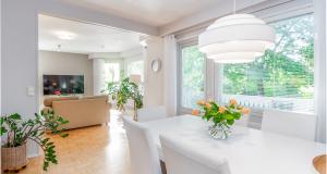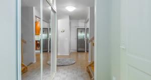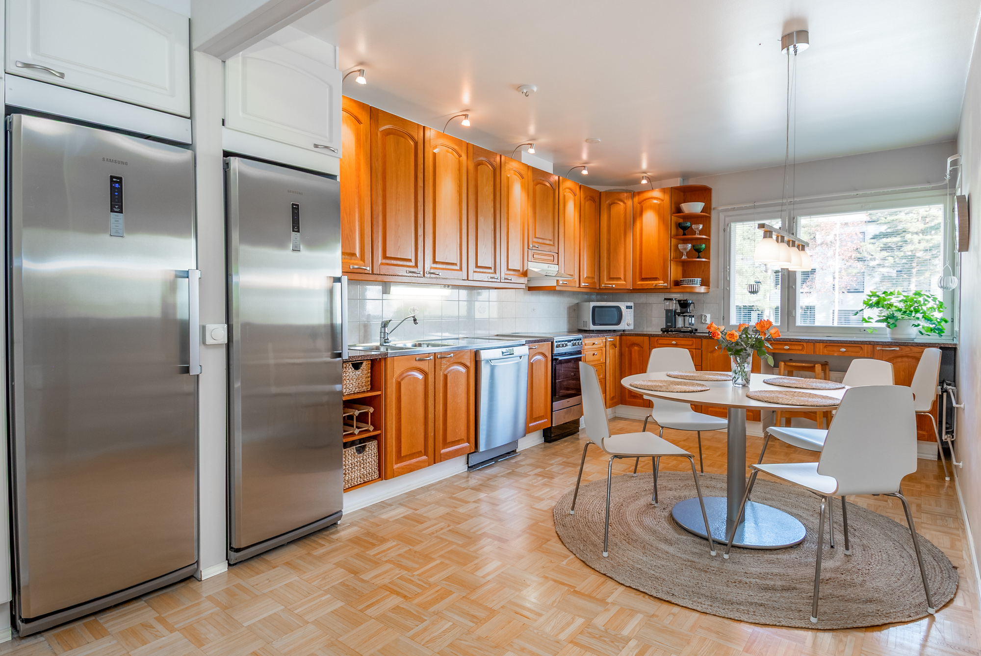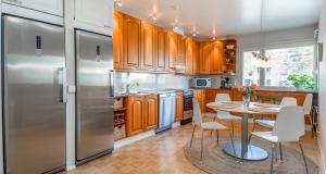 Tilava keittiö, missä paljon säilytys- ja työtasotilaa. Keittiö yhdistyy oleskelutiloihin. Korkeat jää- ja pakastinkaappi, keraaminen liesi, liesituuletin, astianpesukone.