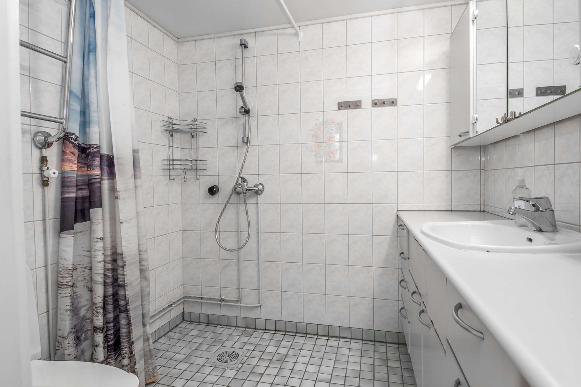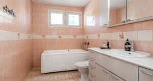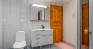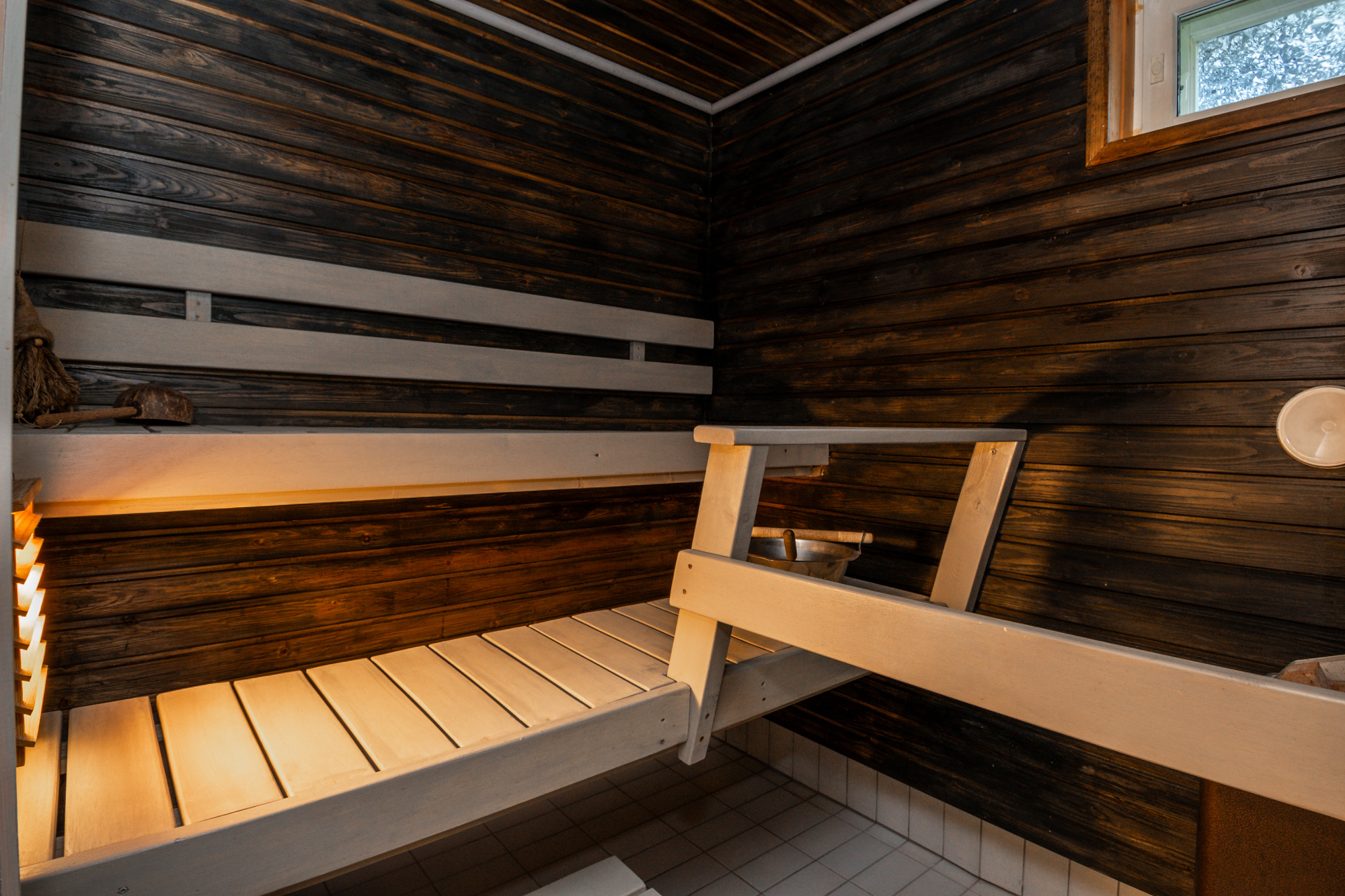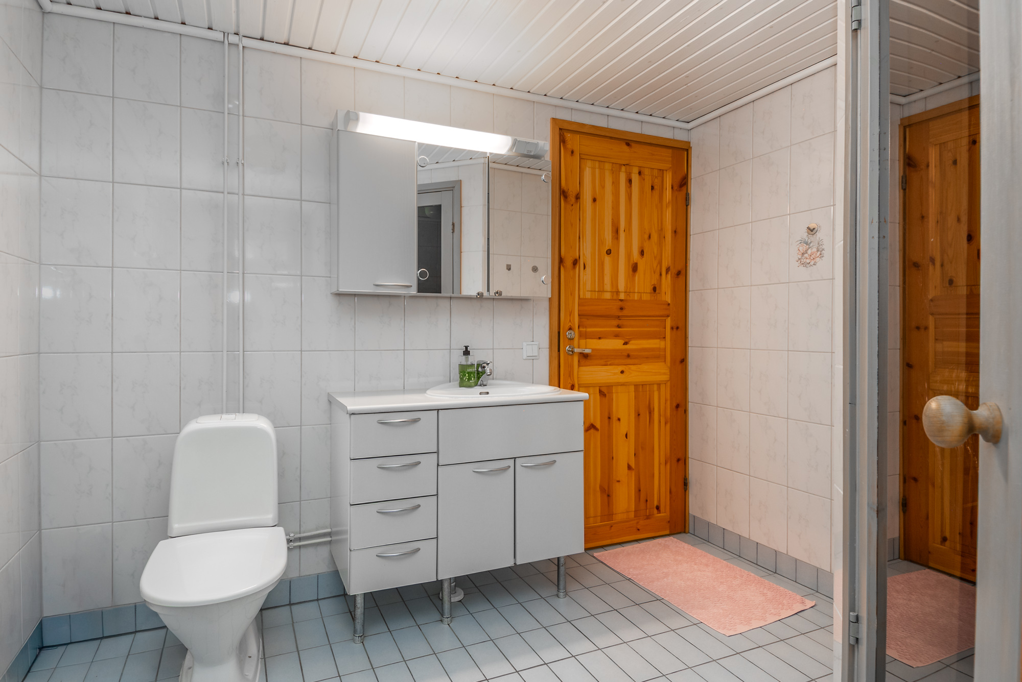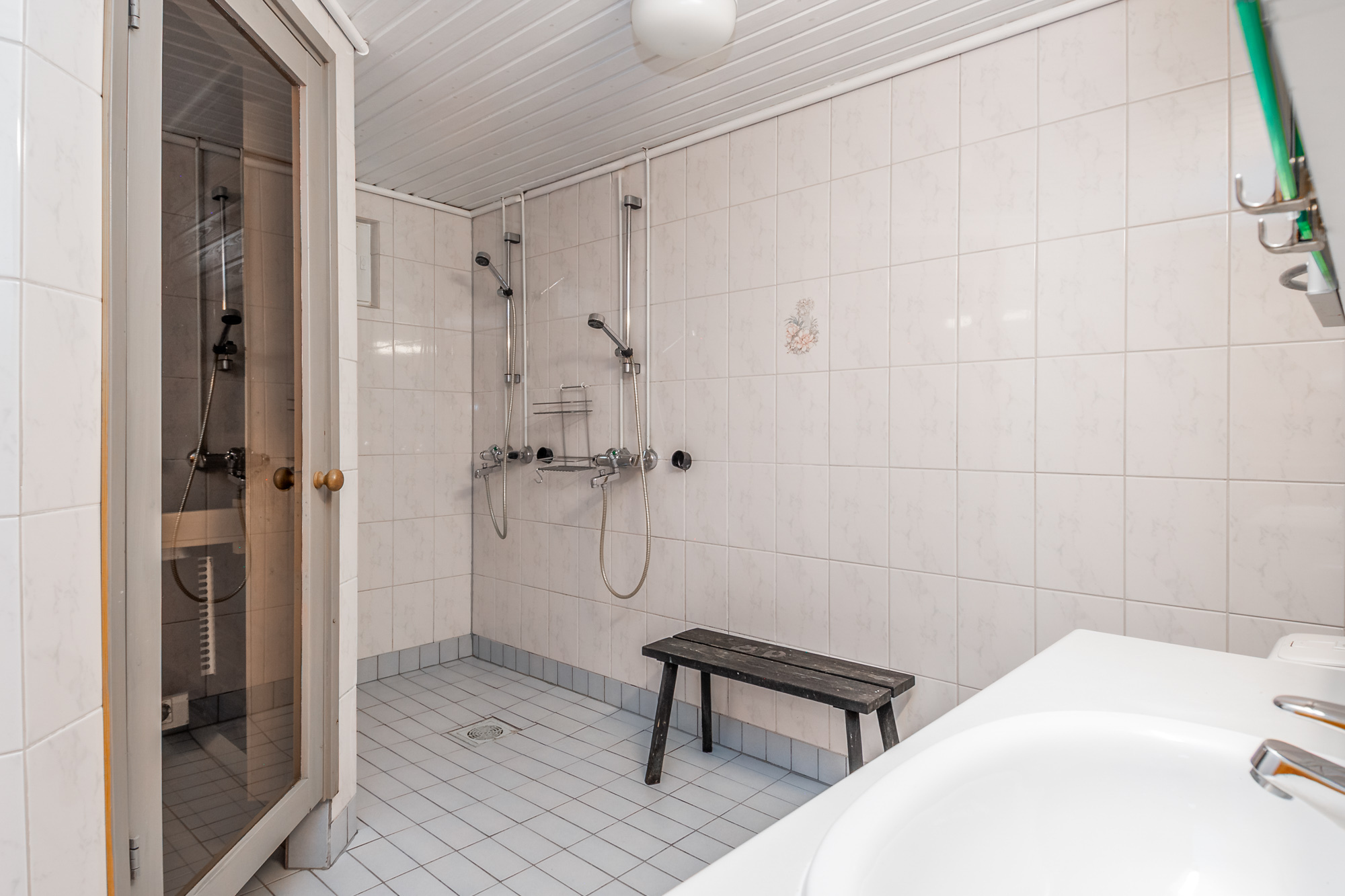 Isot kylpyhuoneet molemmissa asuinkerroksissa - saunatilat kellarikerroksessa. Suihku siten asunnon jokaisessa kerroksessa. Kaikissa pesutiloissa lattialämmitys (vesikierto).
