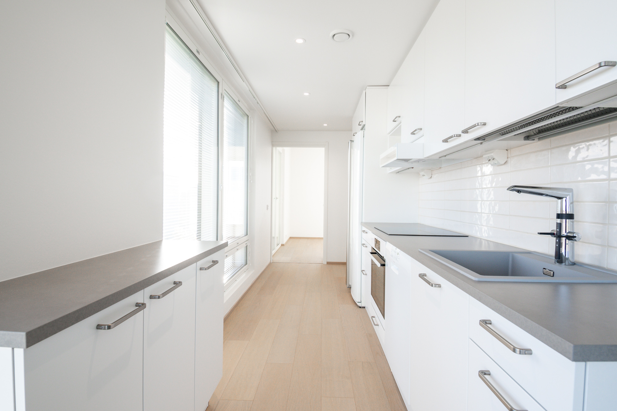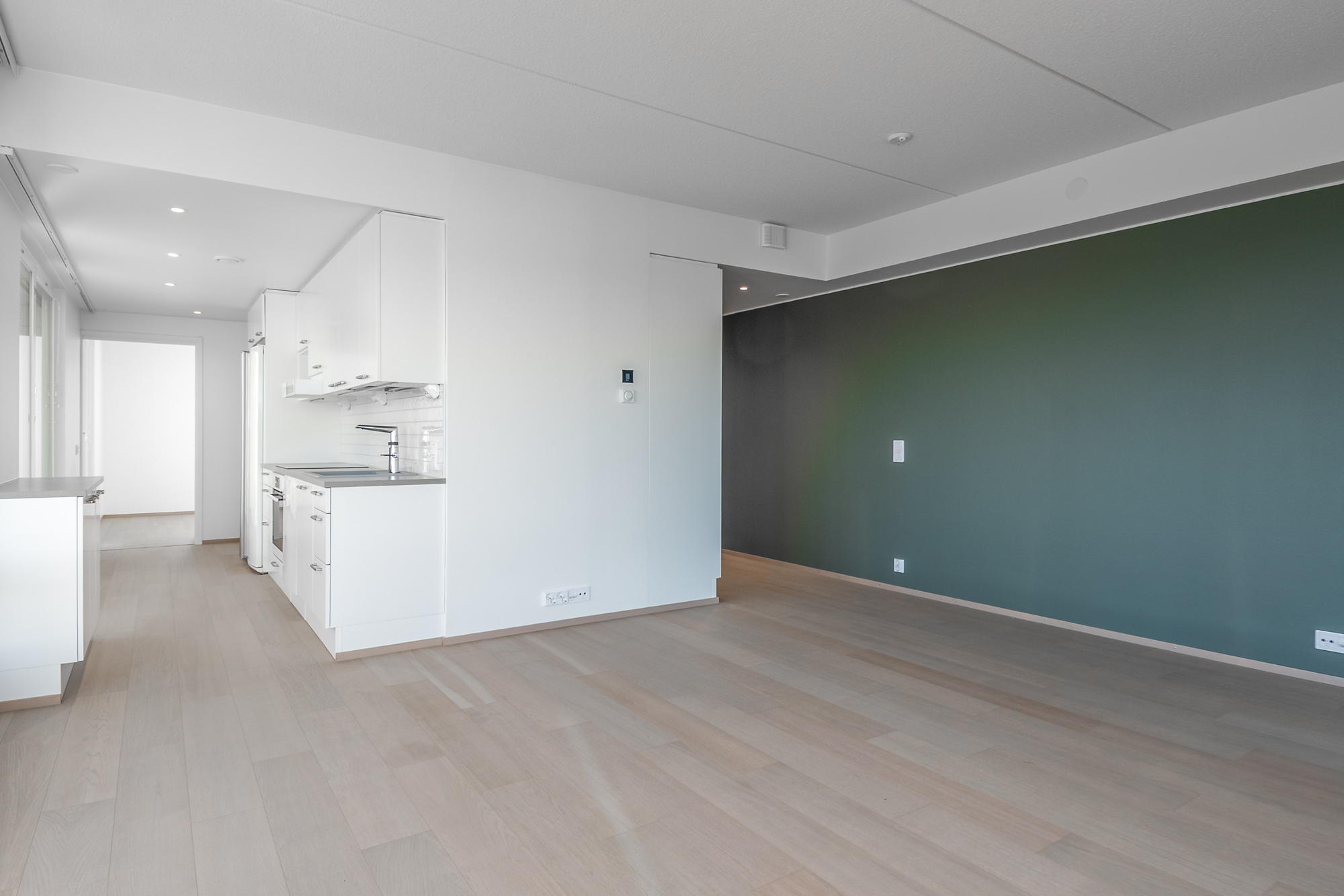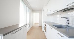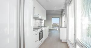 Avoin keittiötila, kulku olohuoneeseen. Jääkaappi, pakastin, induktioliesi, liesituuletin, erillinen uuni sekä astianpesukone. Ohutpuulattia (tammi). Vesikiertoinen lattialämmitys.