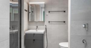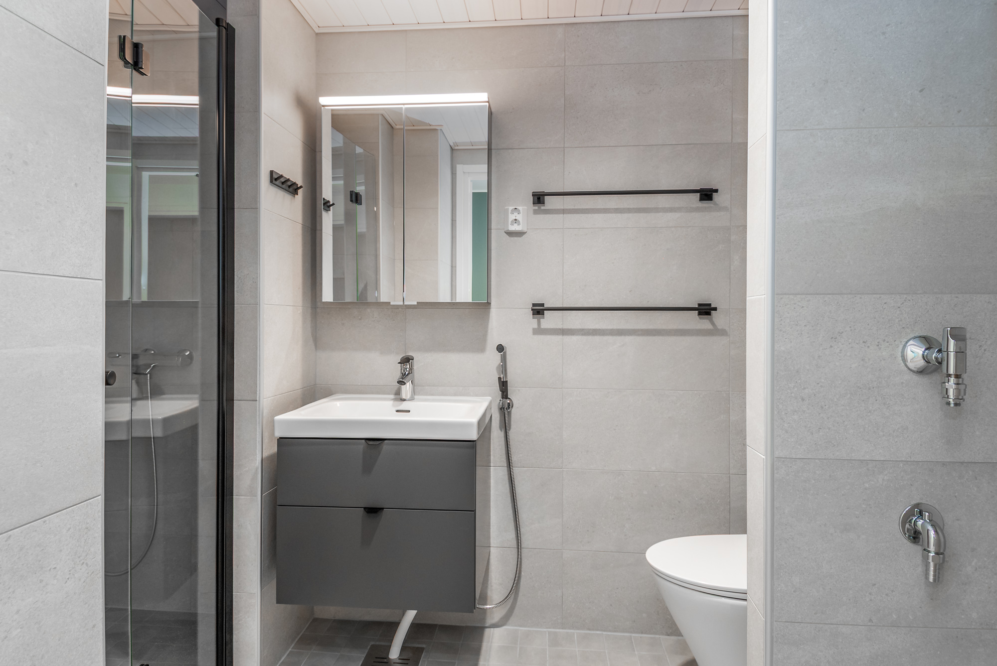 Kylpyhuoneessa vesikiertoinen lattialämmitys sekä tilaa pesutornille.