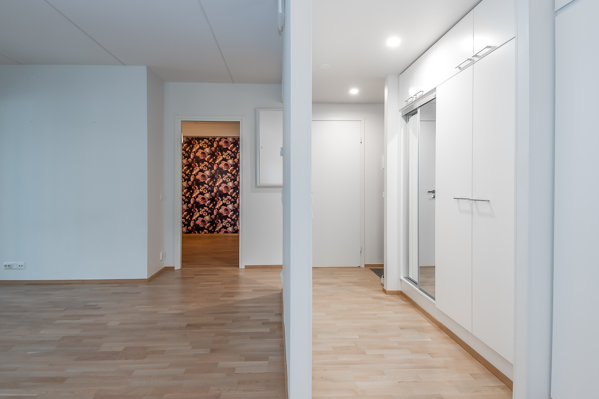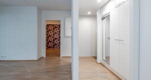 Hörnlägenhet med bastu, köket och vardagsrummet bildar ett gemensamt öppet utrymme. Utgång till den 22,5 m2 stora balkongen från vardagsrummet. Balkongen kan hållas varm året runt – golvvärme med el. De moderna skjutdörrarna mellan vardagsrummet och balkongen skapar en ännu större helhet.