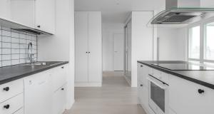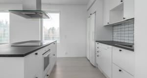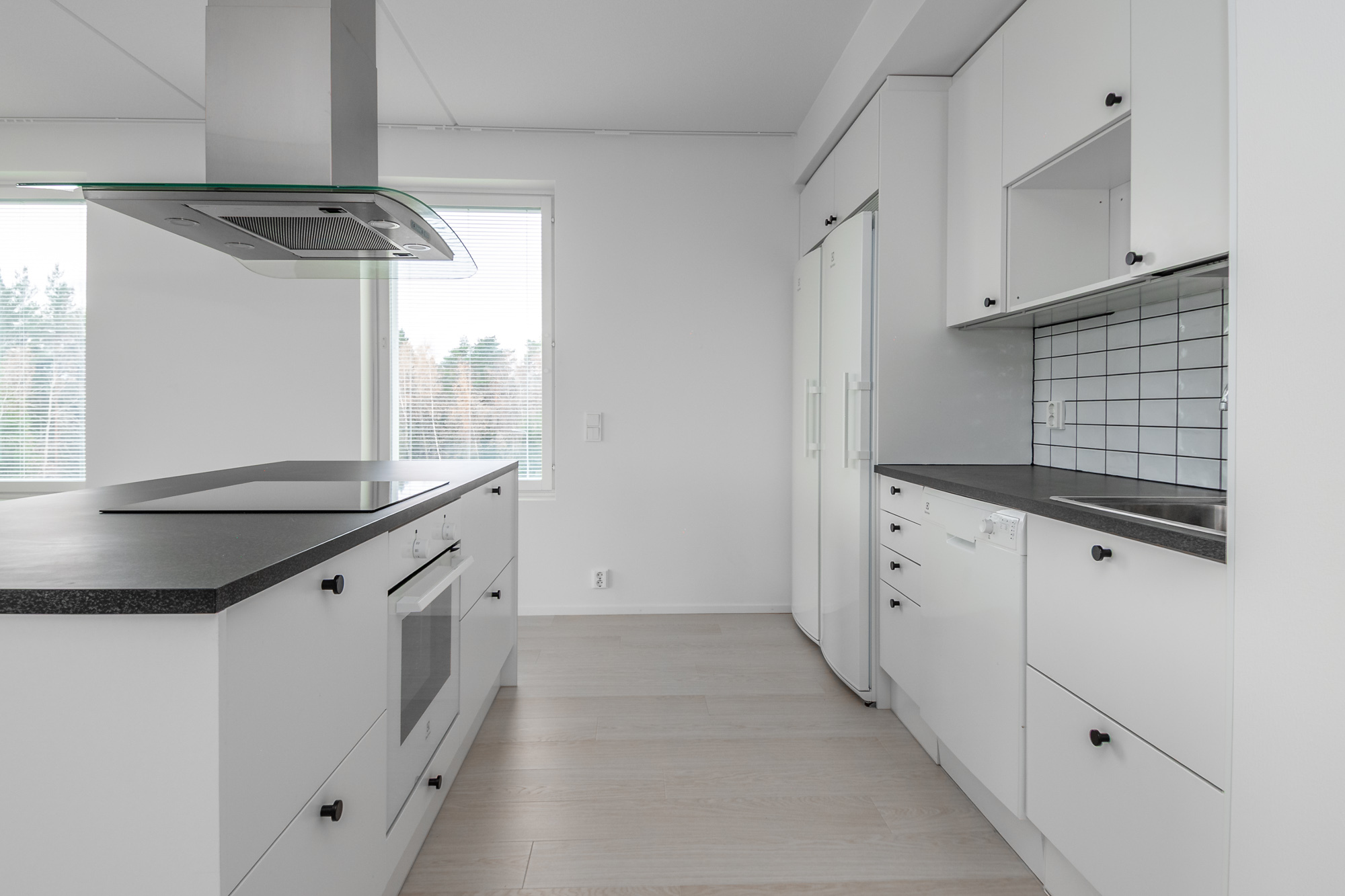 Keittiö ja olohuone yhtä tilaa. Korkeat jääkaappi ja pakastinkaappi, induktioliesi, liesituuletin, kalusteuuni, astianpesukone.