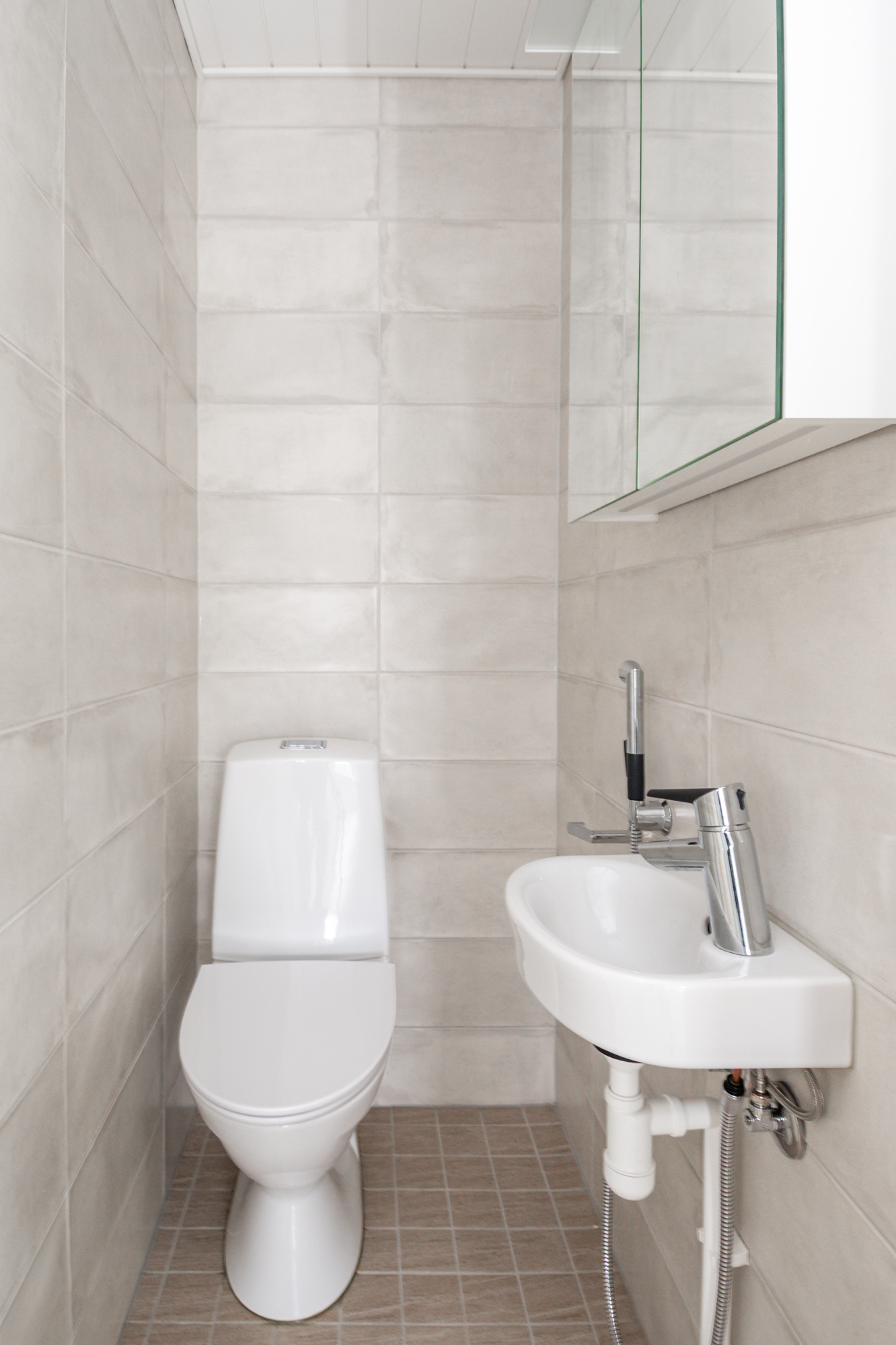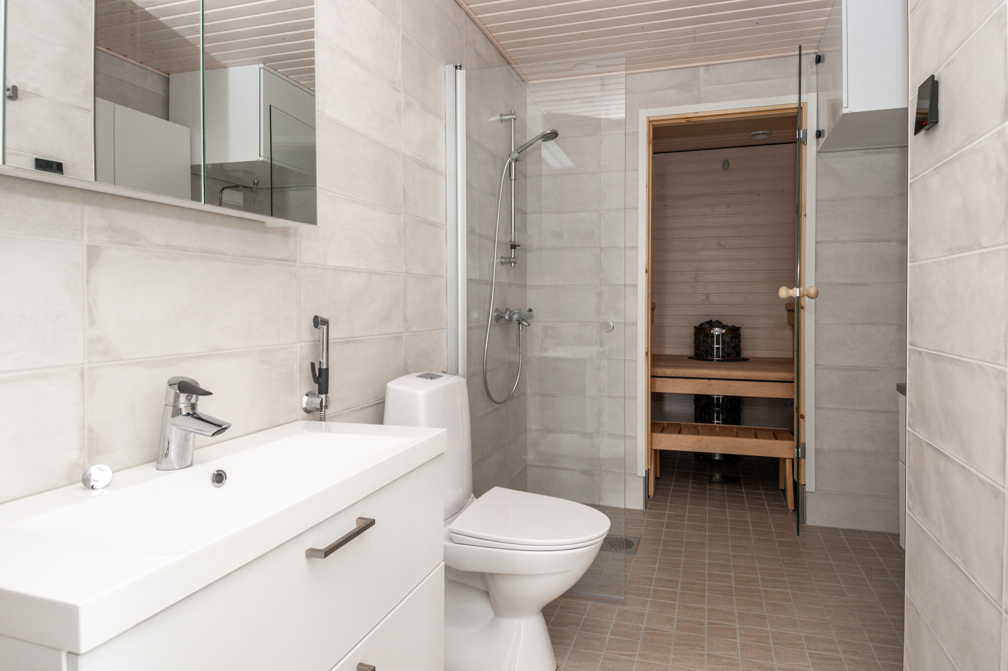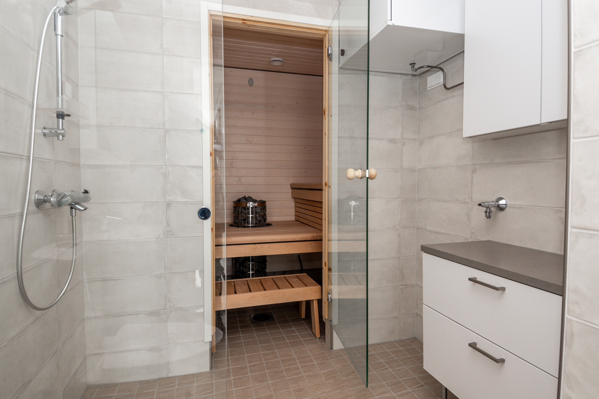 Tilava kylpyhuone oman saunan yhteydessä. Tilaa pesutornille.
